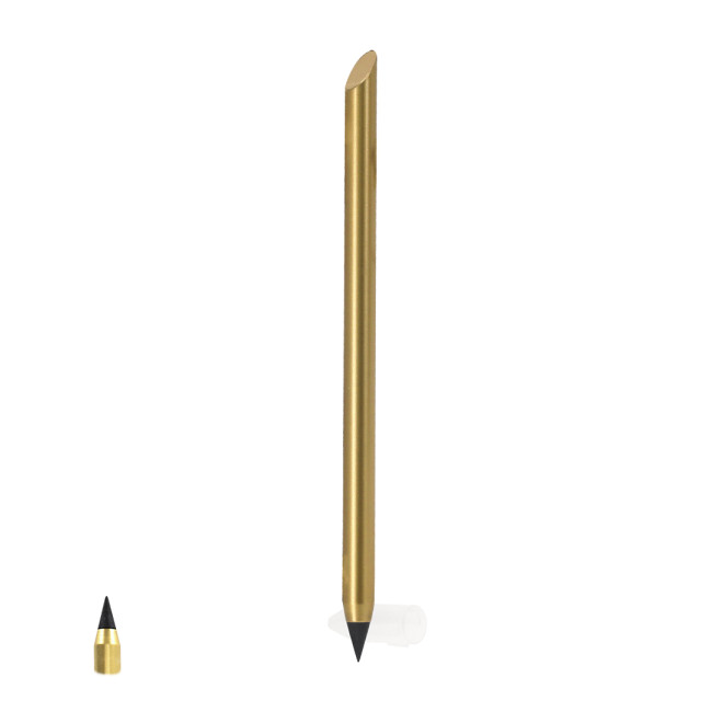 Matita eterna realizzata in alluminio riciclato. Riutilizzabile e con scrittura infinita, per usare sempre la stessa matita senza produrre rifiuti. Include distintivo in alluminio riciclato sulla parte superiore e copertura protettiva per preservare la punta in grafite.