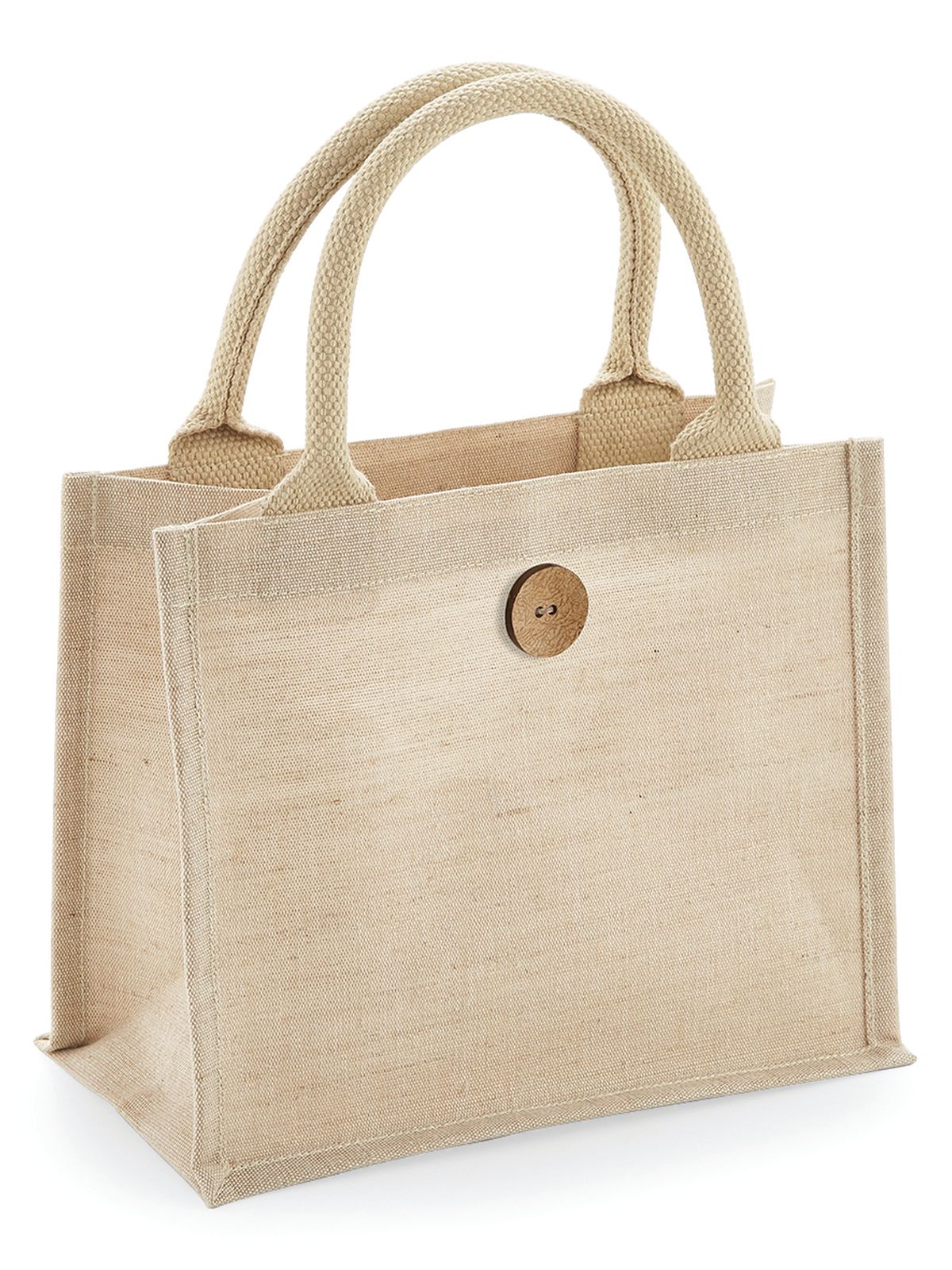 Juco laminato (mix 75% juta, 25% cotone). Borsa a chiusura con cordino e bottone in legno. Etichetta removibile. Lunghezza manico: 35 cm, dimensioni: 26 x 22 x 14 cm, capacita': 6 litri, area stampabile: 18 x 14 cm.