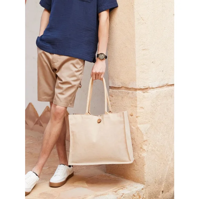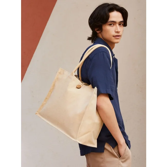 Juco laminato (mix 75% juta, 25% cotone). Borsa con chiusura con cordino e bottone in legno. Etichetta removibile. Lunghezza manico: 55 cm, dimensioni: 42 x 33 x 19 cm, capacita': 21 litri, area stampabile: 34 x 24 cm.