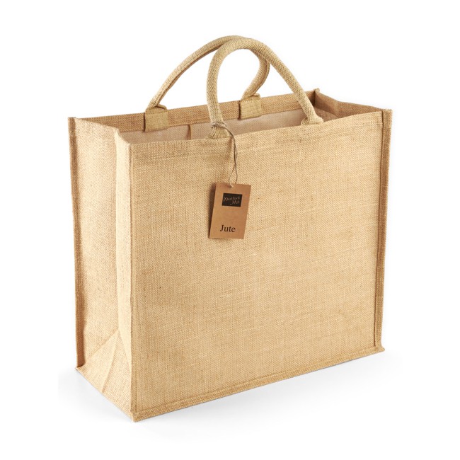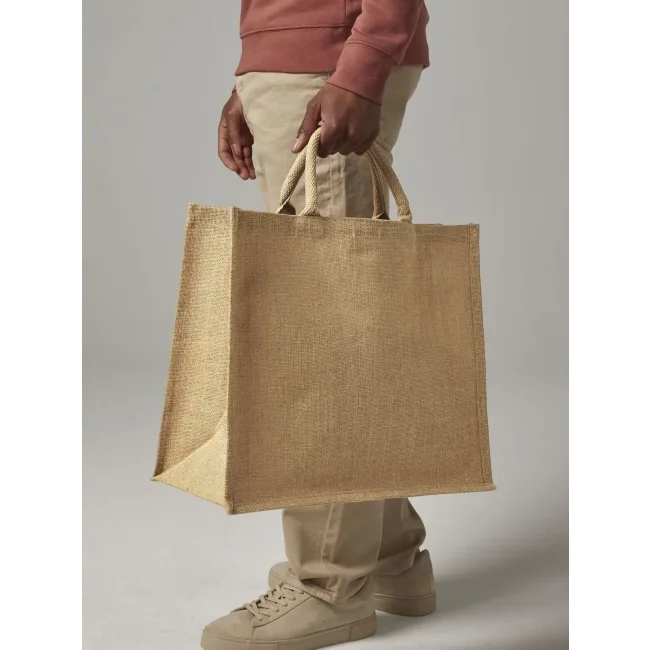 100% Juta laminata. Shopper con manici in cotone robusto. Etichetta removibile. Lunghezza manici: 37 cm, dimensioni: 39 x 45 x 21 cm, capacita': 29 litri, area stampabile: 28 x 36 cm.