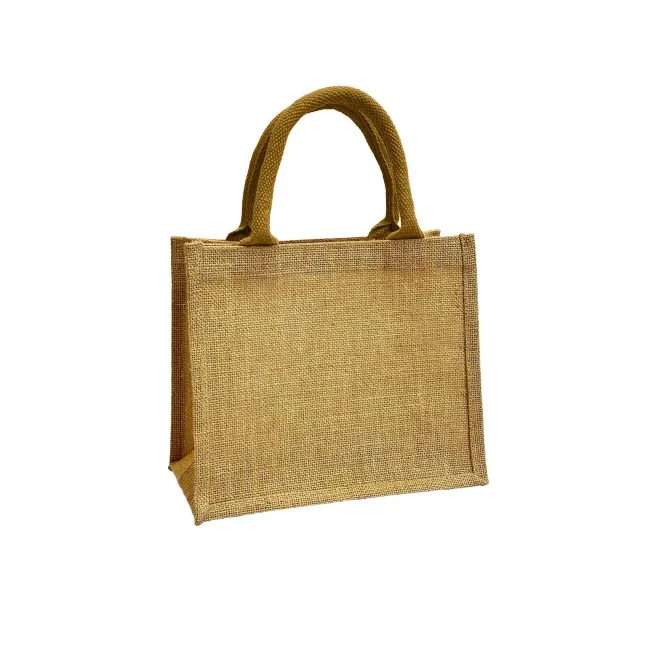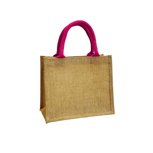 100% Juta. Borsa con manici in cotone. Lunghezza manico: 35 cm, dimensioni: 26 x 22 x 14 cm, capacita': 6 litri. Area stampabile: 18 x 14 cm.
