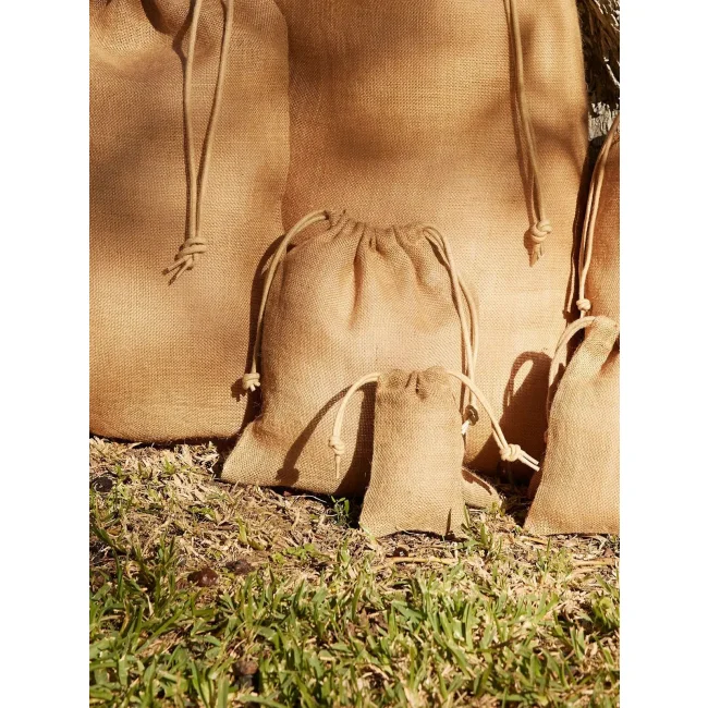 100% Iuta. Sacca con chiusura a coulisse con doppio laccio. Etichetta removibile. Dimensioni: XXS: 10x15 cm, cap. 0,25 lt. - XS: 14x20 cm, cap. 1 lt. - S: 25x30 cm, cap. 3 lt. - M: 30x45 cm, cap. 8 lt. - L: 40x55 cm, cap. 15 lt. - XL: 55x75 cm, cap. 40 lt.