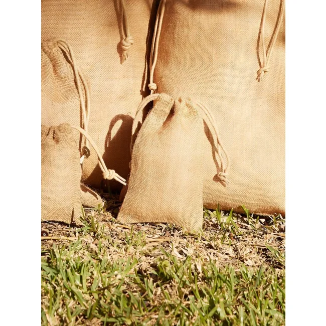 100% Iuta. Sacca con chiusura a coulisse con doppio laccio. Etichetta removibile. Dimensioni: XXS: 10x15 cm, cap. 0,25 lt. - XS: 14x20 cm, cap. 1 lt. - S: 25x30 cm, cap. 3 lt. - M: 30x45 cm, cap. 8 lt. - L: 40x55 cm, cap. 15 lt. - XL: 55x75 cm, cap. 40 lt.