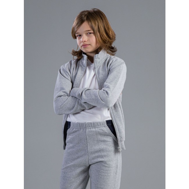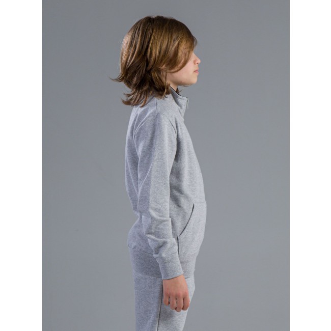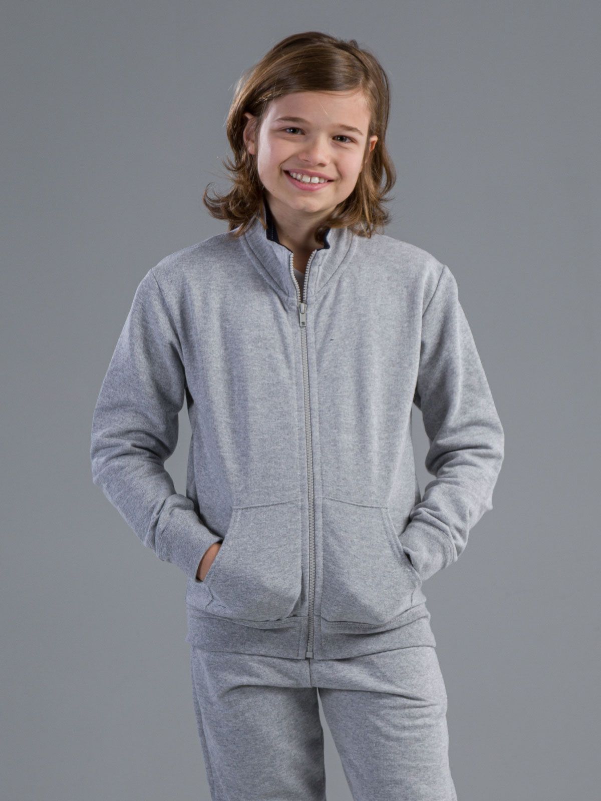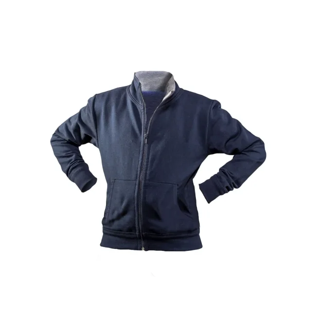 70% cotone, 30% poliestere. Felpa zip intera maniche lunghe set-in, tasca a marsupio, non felpata internamente.