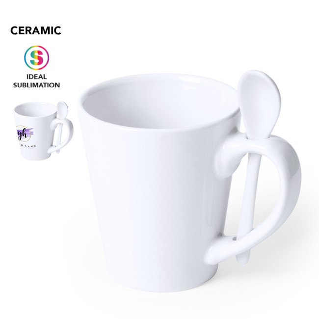 Tazza in ceramica da 350 ml di colore bianco con cucchiaio in ceramica integrato nel manico. Appositamente progettata per la stampa in sublimazione. Presentata in una scatola individuale.Manuale di istruzioni disponibile in spagnolo e inglese.