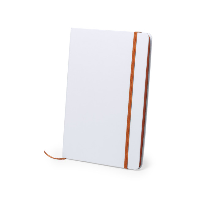 Block notes con copertina rigida soft-touch di colore bianco. Di 100 fogli a tinta unita con dorso in colori divertenti, rilegatura elastica e segnalibro in tessuto coordinati.