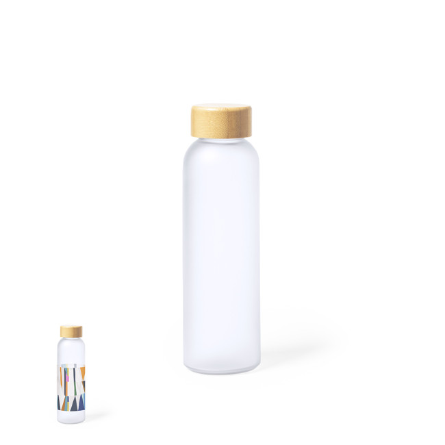 Borraccia della linea natura da 500 ml, appositamente realizzata per la stampa in sublimazione. Corpo in vetro, con tappo a vite in bambù e BPA free. Presentato in una scatola individuale dal design ecologico.