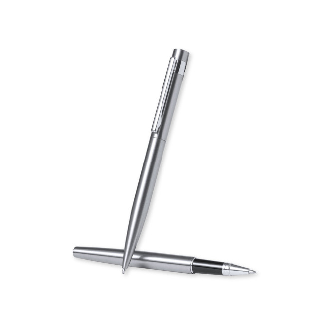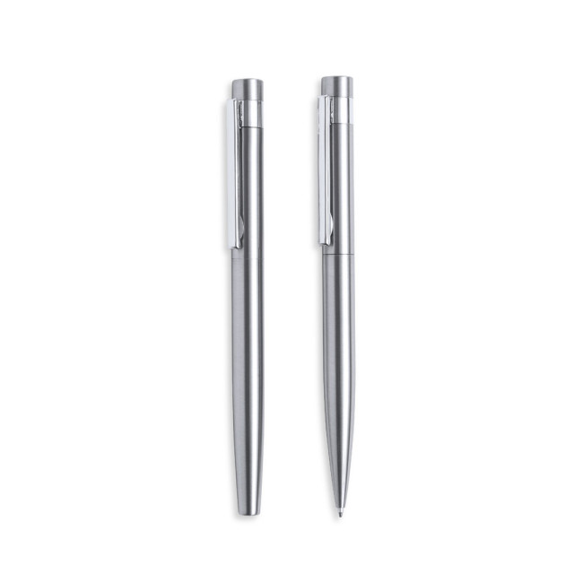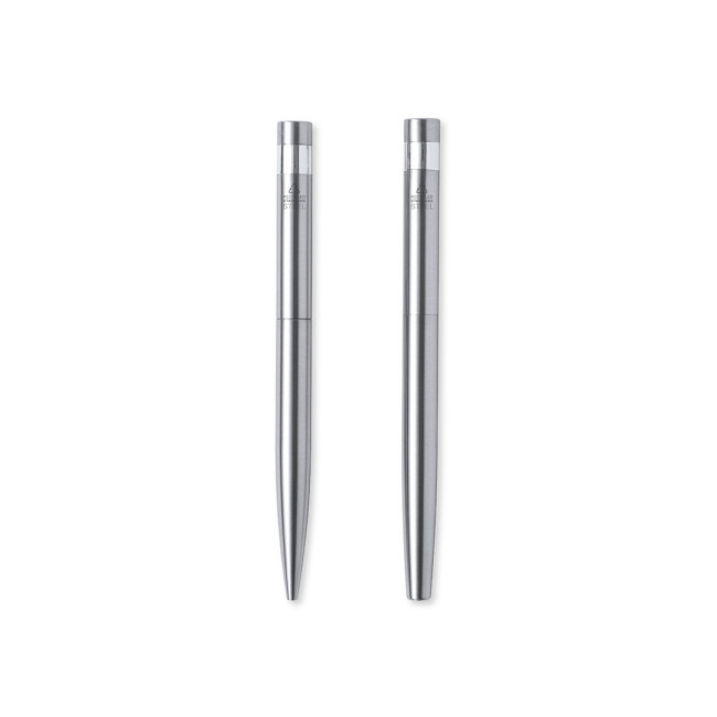 Set ecologico di penna e roller, in acciaio inossidabile riciclato. Include: Penna con meccanismo a rotazione, fusto con rifinitura argentata e dettagli cromati. Clip in metallo e etichetta acciaio inossidabile riciclato sulla parte superiore della penna. Cartuccia Jumbo e inchiostro blu.Roller con fusto color argento e finiture cromate. Clip in metallo e etichetta acciaio inossidabile riciclato sulla parte superiore del cappuccio. Cartuccia Jumbo e inchiostro blu.Il set è presentato in un astuccio individuale di design kraft con custodia abbinata.L'acciaio è uno dei materiali più ricercati e si trova praticamente ovunque, dai prodotti di uso quotidiano alle grandi costruzioni. Le sue innumerevoli proprietà, tra cui la durata e l'alto grado di riutilizzabilità, lo rendono un'alternativa molto apprezzata per le soluzioni di sostenibilità. Se trattata correttamente, permette di ottenere nuove risorse di uso infinito.