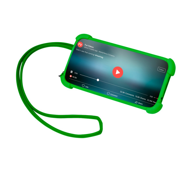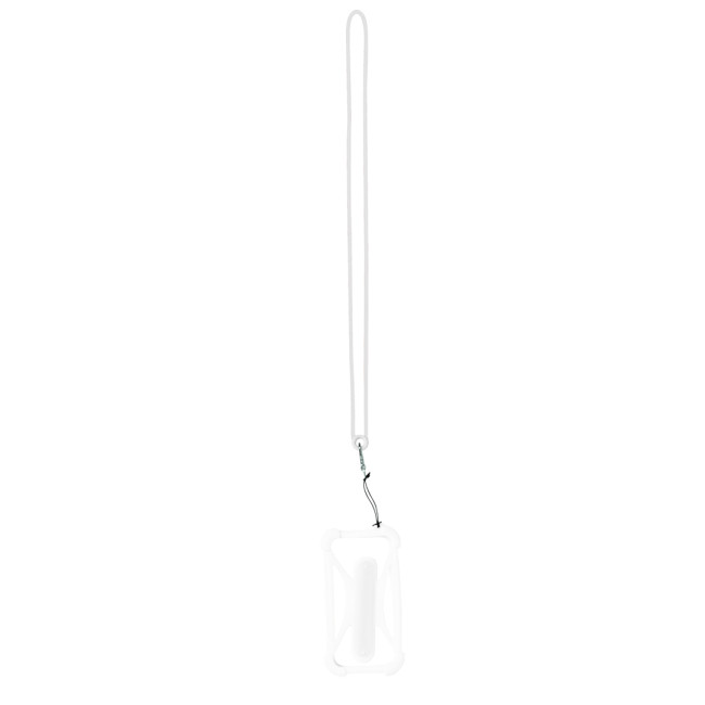 Pratico lanyard in resistente silicone. Include un accessorio per cellulare coordinato, rinforzato agli angoli e con un supporto pieghevole sul retro. Con moschettone girevole in metallo e disponibile in vari colori.