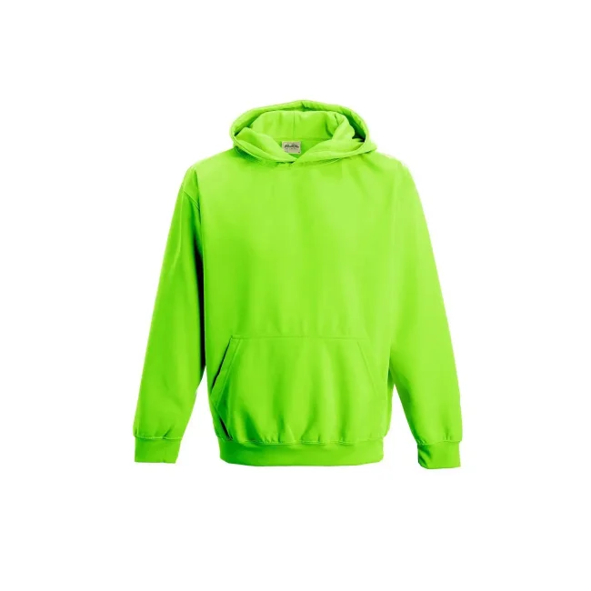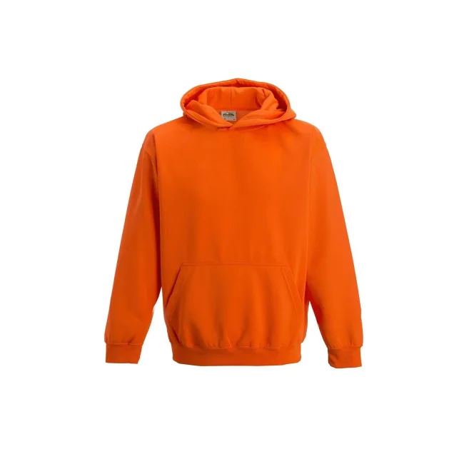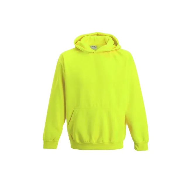 80% poliestere, 20% cotone ringspun. Felpa bambino dai colori molto accesi con cappuccio doppio strato, senza cordini conformamente alla normativa europea. Doppie cuciture a dettaglio, felpata internamente, tasca a marsupio. Polsini e orlo a costine. Etichetta a strappo perfetta per il rebranding.