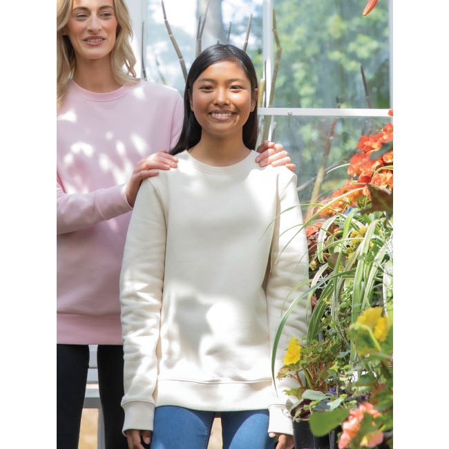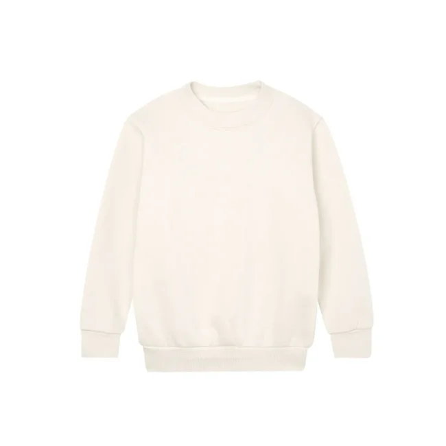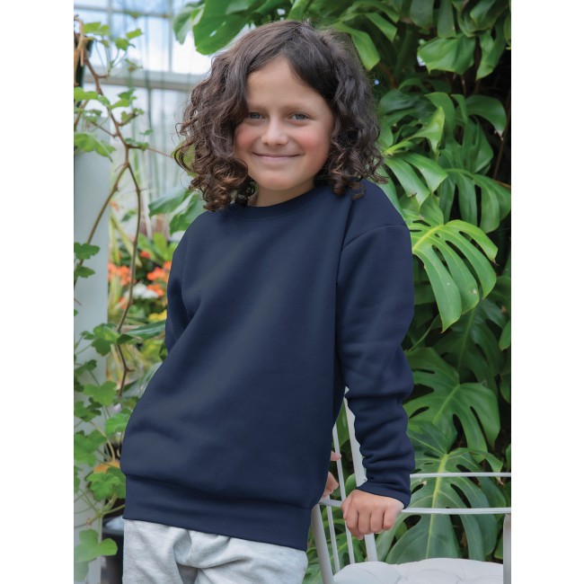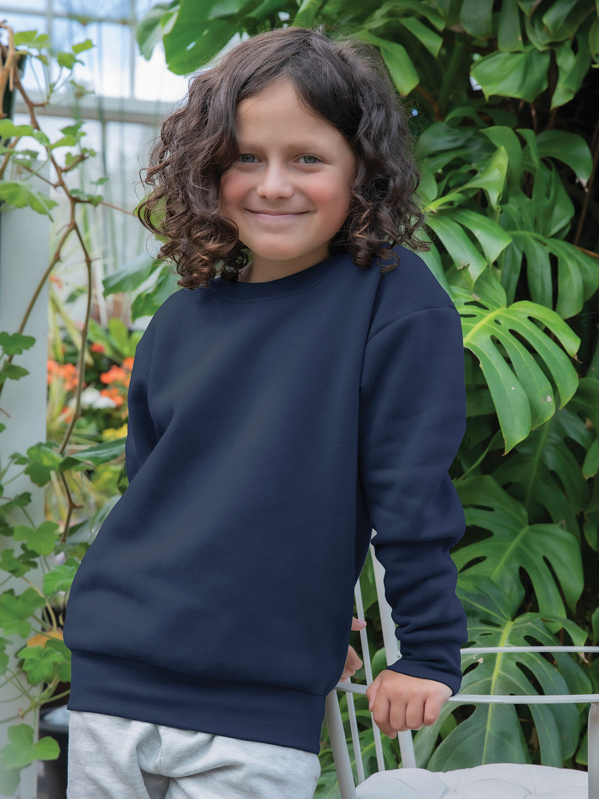 80% cotone (organico o in conversione), 20% poliestere riciclato, 280 g/m2. Felpa girocollo da bambino, vestibilità unisex, maniche set-in, interno felpato, interno felpato, nastro di rinforzo al collo a contrasto. Girocollo, polsini e orlo a costine. Etichetta taglia removibile sul collo. Etichetta con istruzioni di lavaggio in cotone organico.