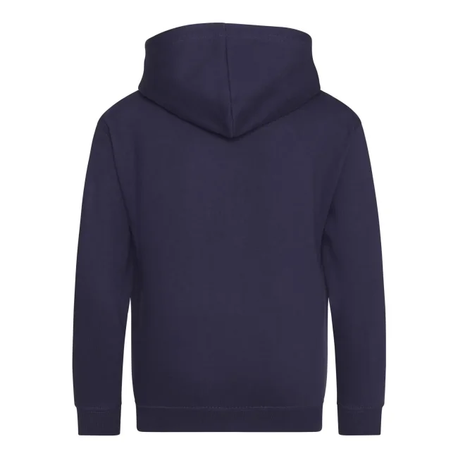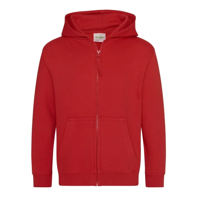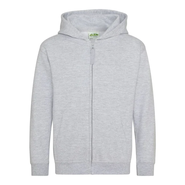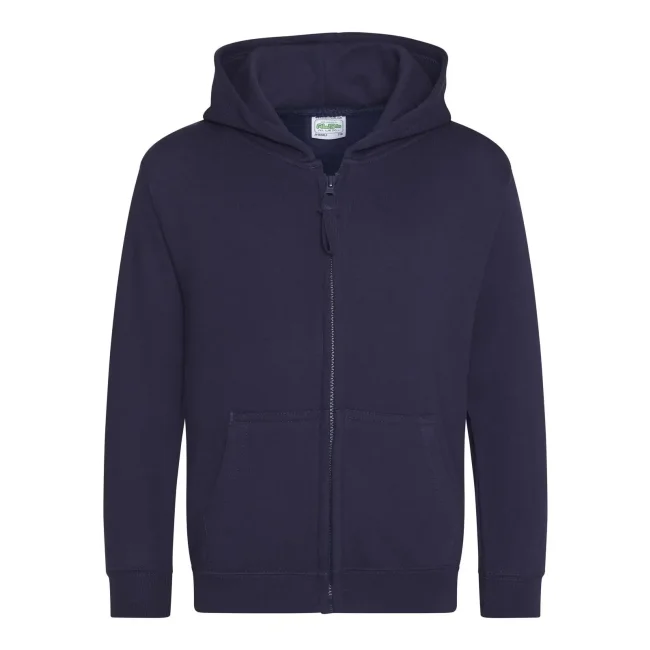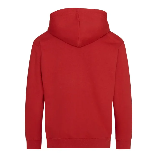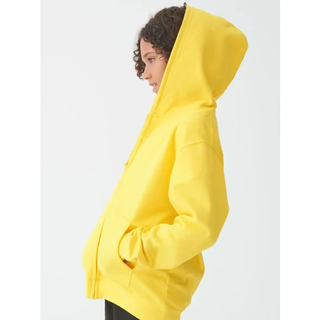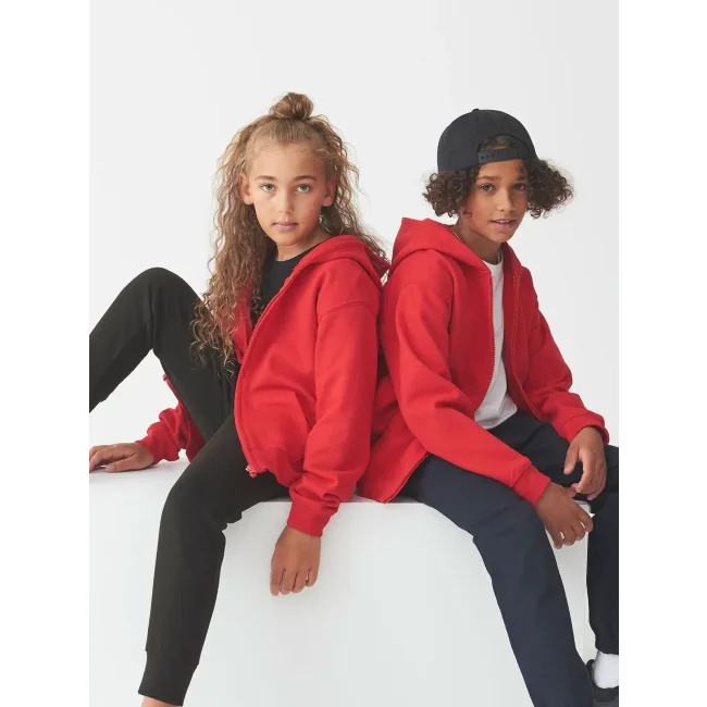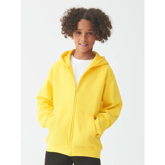 80% cotone, 20% poliestere. Felpa da bambino con cappuccio a doppio strato, cerniera tono su tono nascosta, tasca a marsupio, maniche e vita con polsini, etichetta strappabile. Produzione certificata WRAP (Worldwide Responsible Accredited Production).