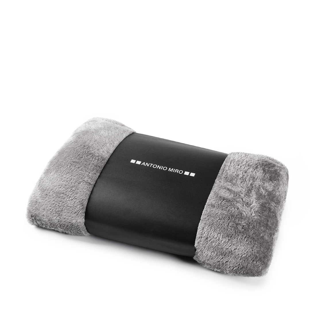 Coperta by Antonio Miró 130x160cm in morbido e caldo pile polare da 260g/m2 con trattamento anti-pilling. Con un elegante design nei toni del grigio e presentata con una fodera con il logo del marchio.