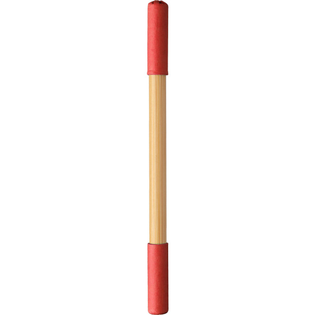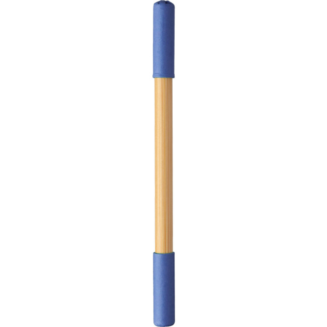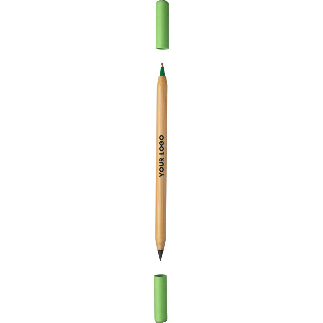 Kit scrittura 2 in 1 in bambù, composto da matita infinita da un lato, e penna a sfera con refill blu dall’altro, entrambi con tappo in cartone colorato