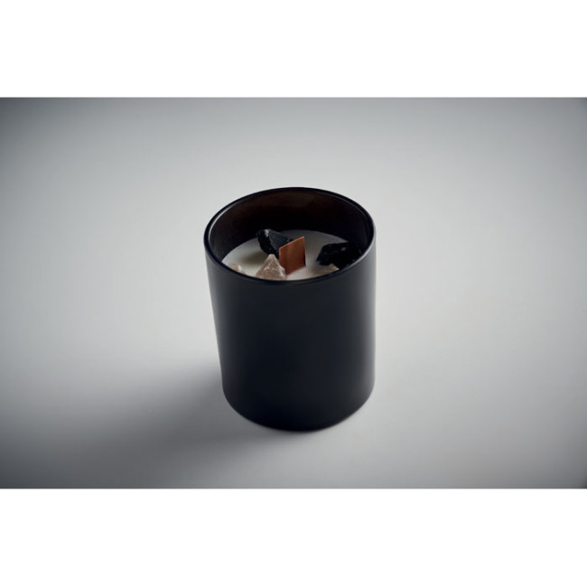 Candela in cera vegetale profumata alla vaniglia in vetro con pietre e stoppino in legno. 200 gr. Tempo di combustione: 20 ore.