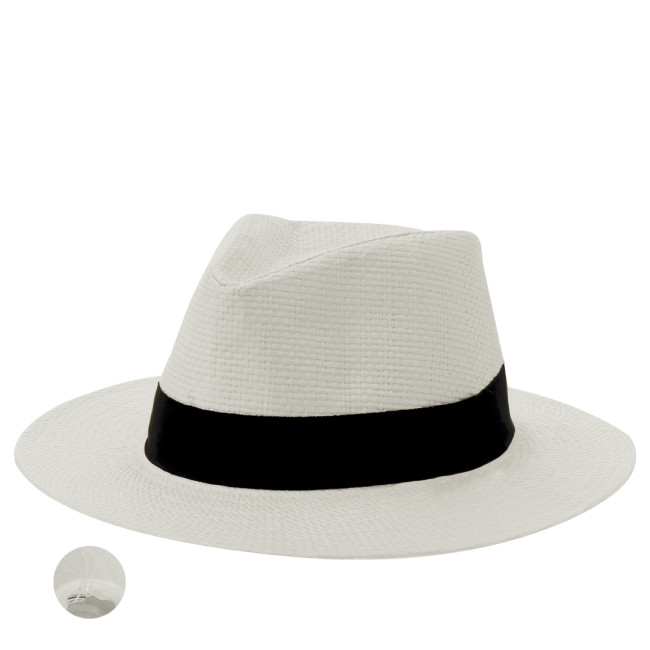 Cappello di alta qualità realizzato in paglia di carta bianca, con nastro alla base di colore nero. Regolabile dall'interno, con nastro esterno e comodo nastro interno.