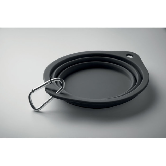 Ciotola portatile pieghevole in silicone per bere o mangiare con moschettone. Capacità: 350 ml.