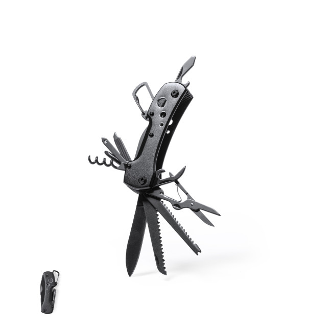 Coltello multiuso con accessori in acciaio inox rifinitura nera e manico in alluminio robusto abbinato con moschettone integrato nell'impugnatura. 13 funzioni, tra cui coltello e rasoio, cacciavite, lima, apriscatole e forbici. Pieghevole e di dimensioni compatte, presentato in una scatola individuale di design nera.
