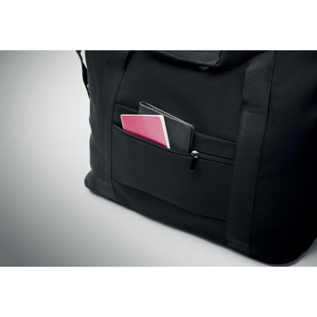 Borsa da weekend in cotone riciclato e poliestere riciclato (70%/30%) con fodera in poliestere 210D RPET. Con tasca frontale, tasca posteriore con cerniera, di una tracolla rimovibile e regolabile e di un fondo imbottito. Custodia per valigia.