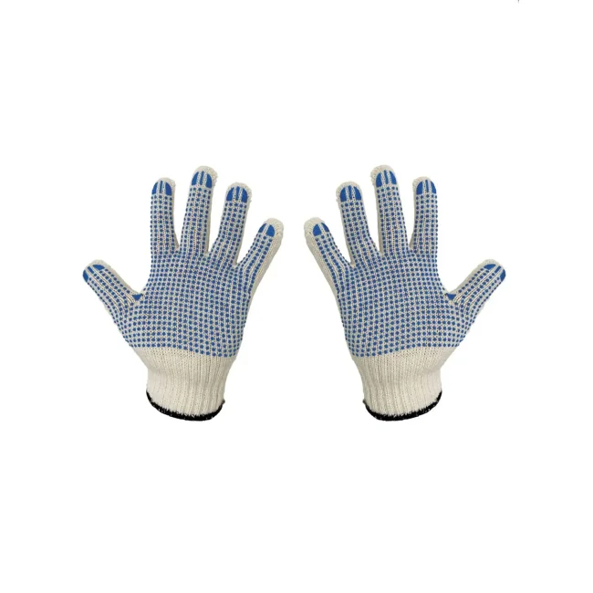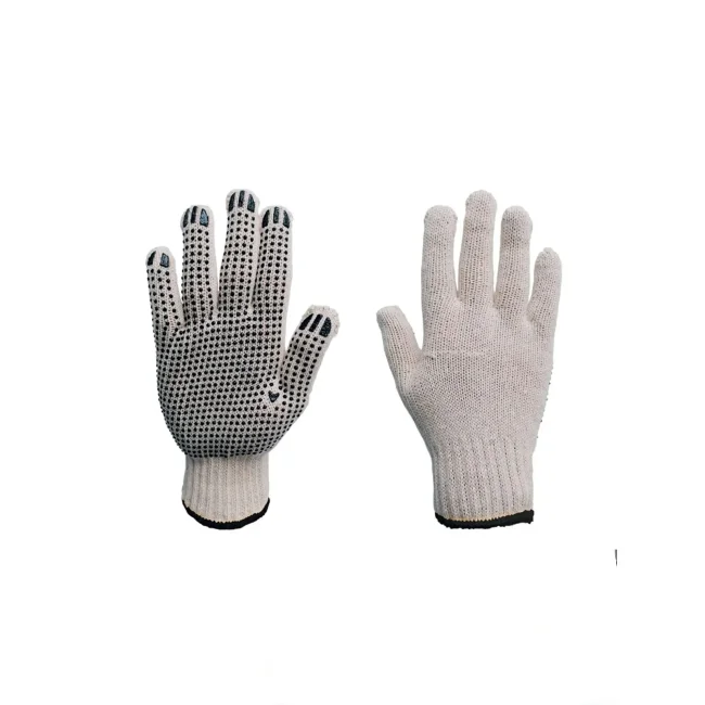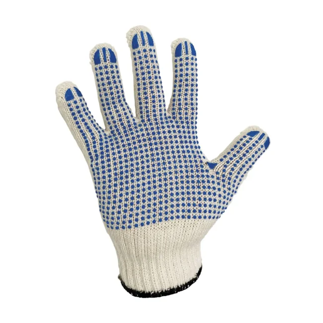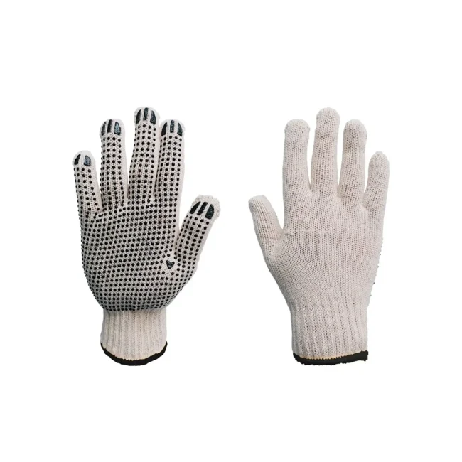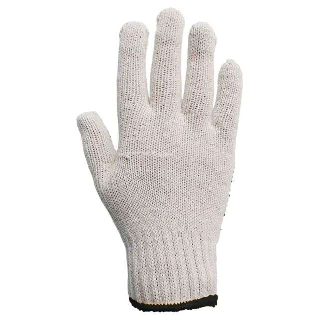 60% poliestere 40% cotone. Guanti in maglia con nylon per una migliore vestibilità, senza cuciture per un maggior comfort. Protezione contro rischi meccanici, inserti in PVC antiscivolo, tessuto traspirante. Colore del polsino: tg. 7= verde, tg. 10= nero. Prodotto certificato secondo EN ISO 21420:2020 Cat. I.