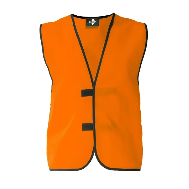 100% poliestere. Gilet facilmente visibile grazie ai colori sgargianti, orli di colore nero, taglia regolabile tramite due chiusure in velcro, imbustato singolarmente.
