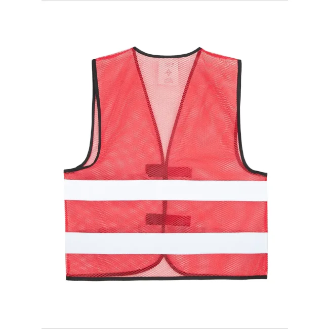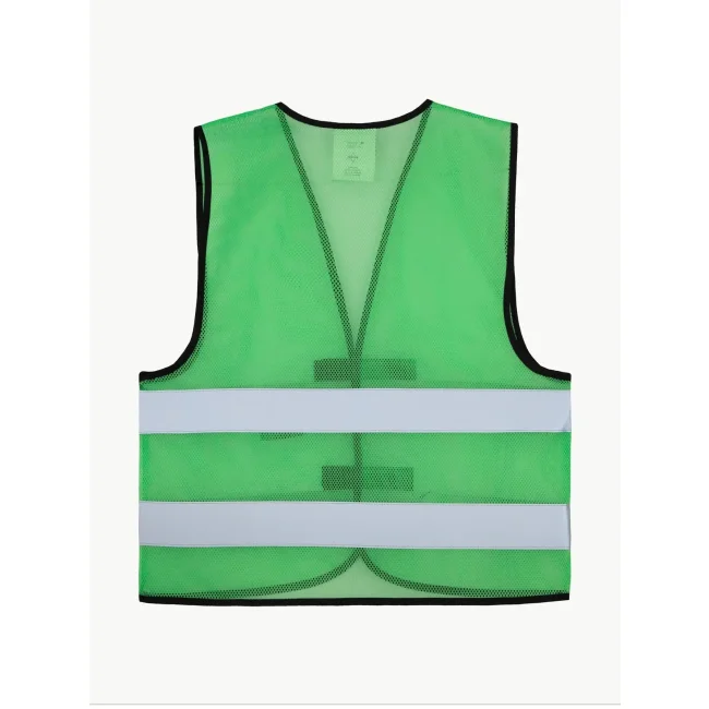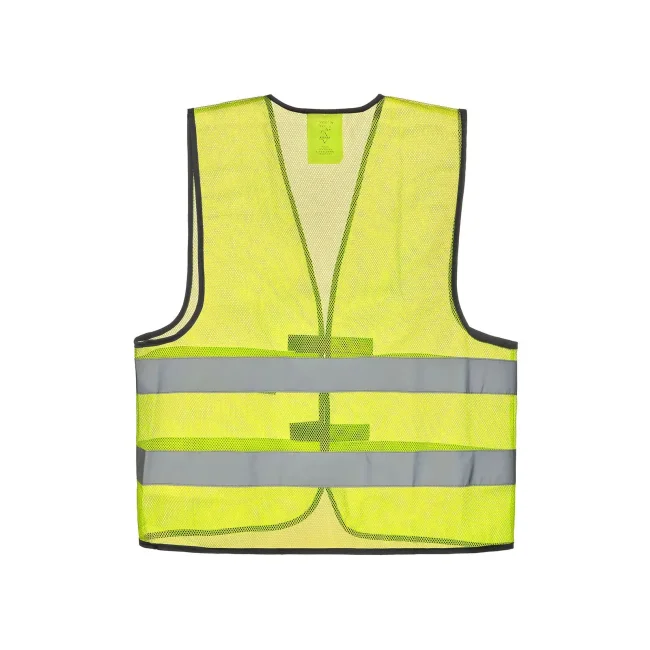 100% poliestere. Gilet estivo in mesh, traspirante, orli di colore nero, due strisce di sicurezza di larghezza 5 cm sul busto, taglia regolabile tramite due chiusure con velcro sul davanti, imbustato singolarmente.