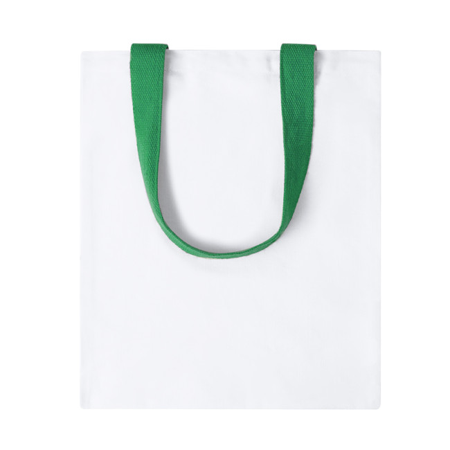 Borsa in tela da 230 g/m2. In bianco, con finitura cucita resistente e manici rinforzati in diversi colori, lunga 60 cm.