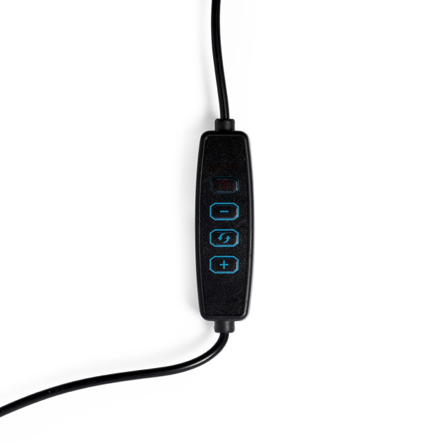 Set di luci. Include anello luminoso, treppiede da tavolo e treppiede da terra con altezza regolabile fino a 180 cm. 120 LED, con 3 posizioni di illuminazione e 10 livelli di intensità luminosa regolabili. Alimentato dalla connessione USB. Cavo con controller e telecomando incluso. Confezionato in una scatola dal design accattivante.