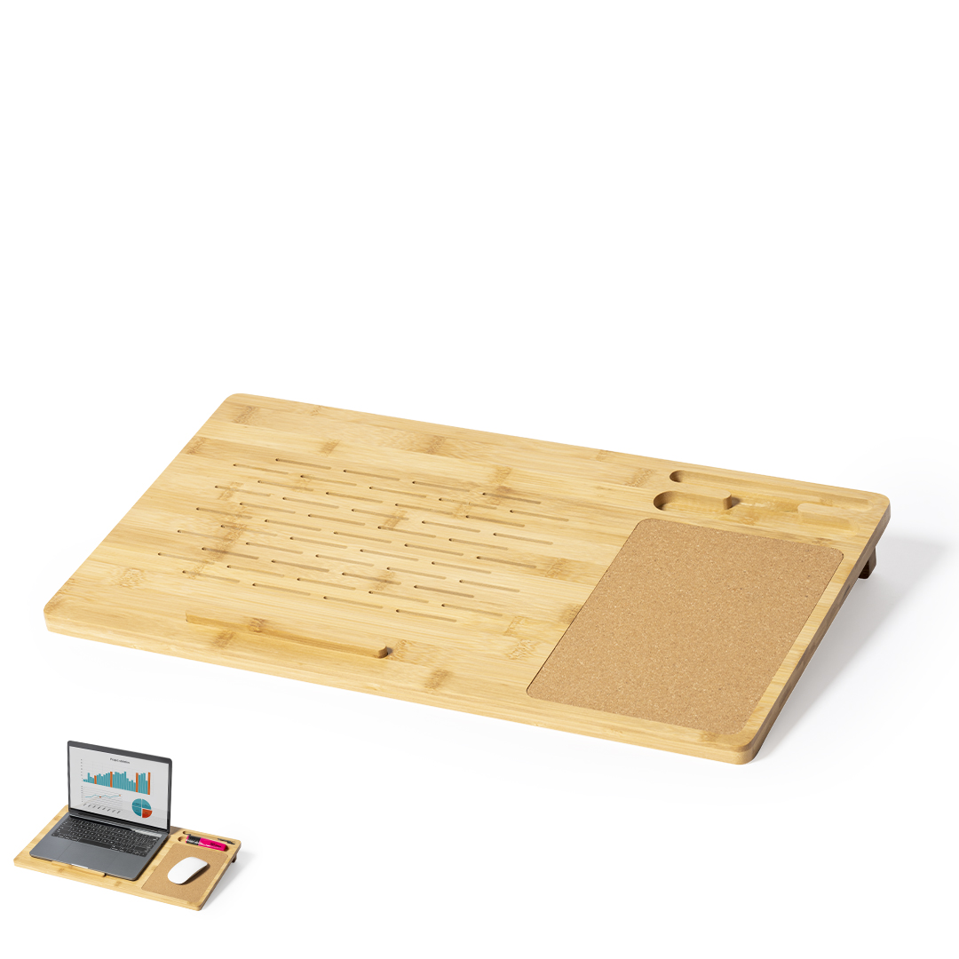 Tappetino organizar multifunzione della linea natura. Realizzato in bambù e sughero naturale, aiutando la sostenibilità del pianeta. Include supporti per laptop, tablet e altri dispositivi mobili. Con tappetino per mouse integrato e presentato in scatola di design kraft individuale.