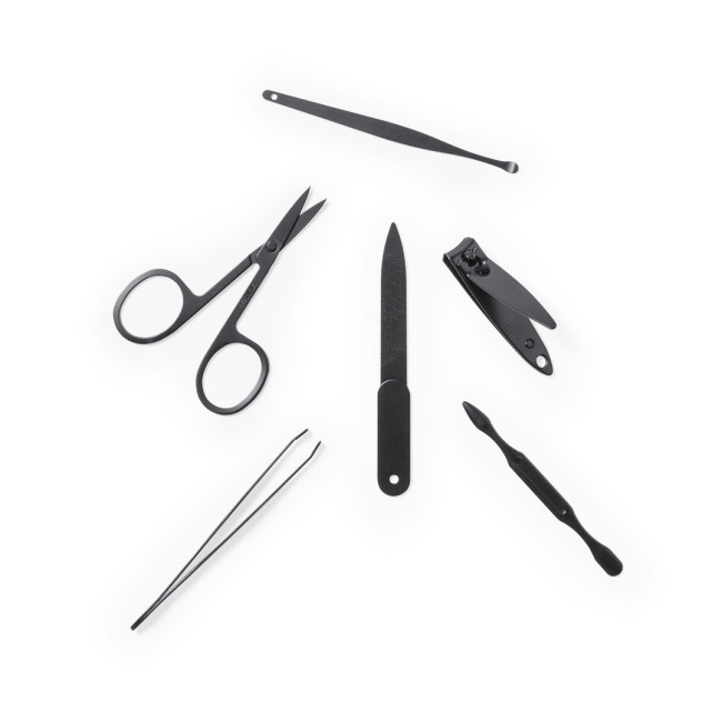Set manicure da 6 accessori, con custodia in resistente feltro RPET, frutto della combinazione del processo di riciclo delle materie plastiche con la tecnica millenaria di produzione del feltro, che dà come risultato un materiale di eco-tendenza che, oltre a essere di origine riciclata, diventa anche riciclabile. Accessori in metallo in acciaio inox con finitura nera: forbici, pinzette, tagliaunghie, lima per unghie e 2 rimuovi cuticole. Con chiusura a bottone ed etichetta distintiva RPET all'esterno.