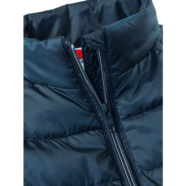 100% poliestere. Tessuto DWR ad alte prestazioni trattato con Aquapel di Nanotex senza fluoro e PFC . Gilet con imbottitura Dupont Sorona. Collo alto con protezione per il mento e pattina antivento interna, zip, fodera e dettagli a contrasto. 2 tasche laterali e 1 tasca interna con zip, Orlo regolabile con coulisse. Discreto accesso per decorazioni sul lato interno sinistro del torace.