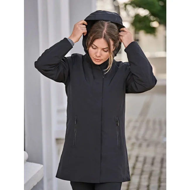 88% poliestere, 12% spandex. Parka da donna, doppio strato con rivestimento in poliestere 310T e imbottitura DuPont, cappuccio, una tasca interna , tasche frontali ampie e foderate, cuciture sigillate, zip bidirezionale e chiusura con bottoni magnetici, impermeabile 8000 mm., traspirante 3000 gr., antivento.