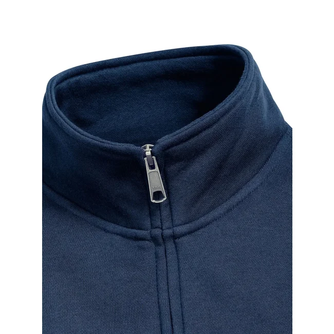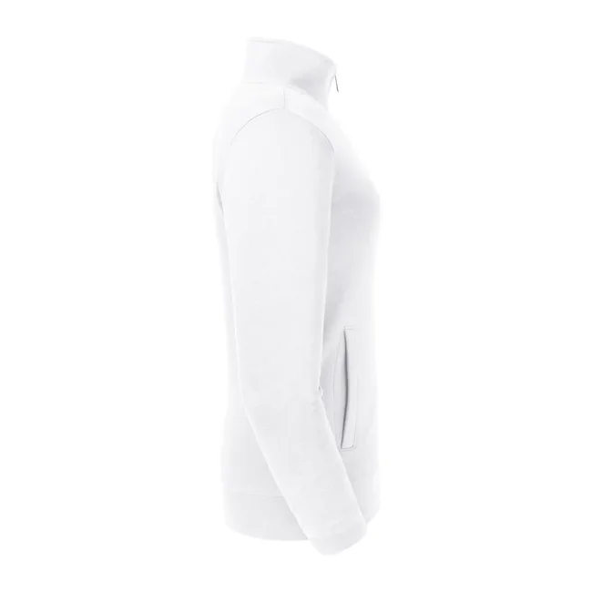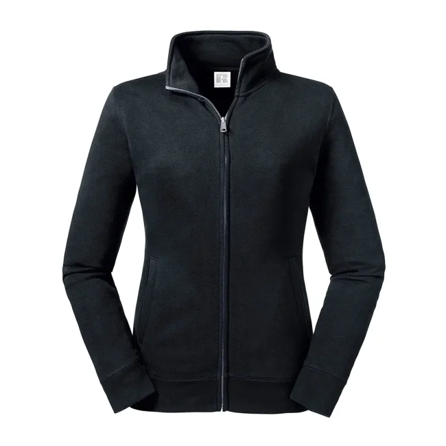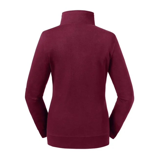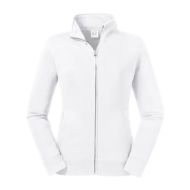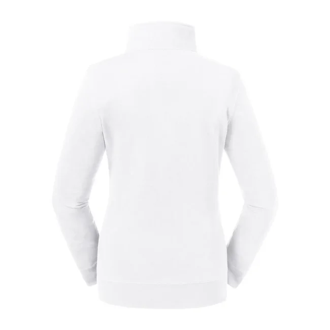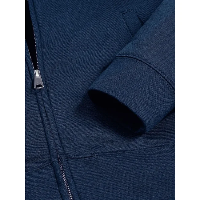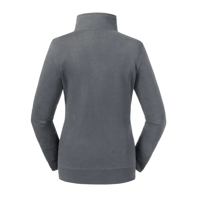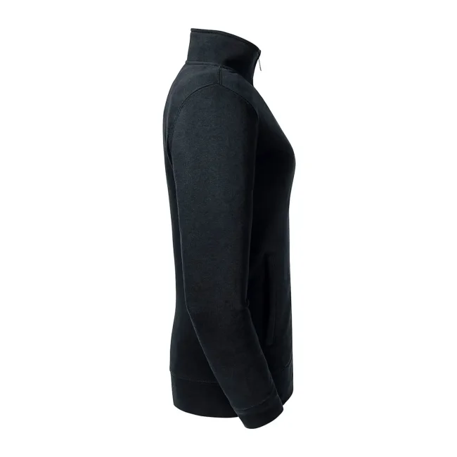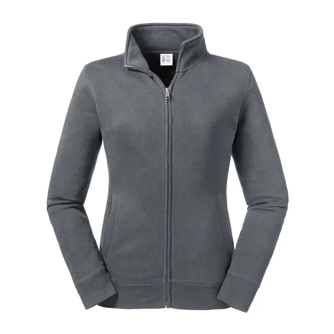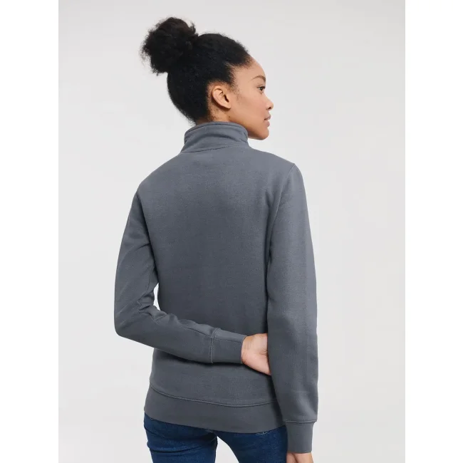 80% cotone ring spun pettinato, 20% poliestere. Tessuto esterno cotone 100% (tessuto a 3 strati). Felpa con zip da donna, spalle e maniche più strette, orli e polsini più ampi, tasca a filetto, zip in metallo YKK (argento antico), nastrino di rinforzo sul collo.