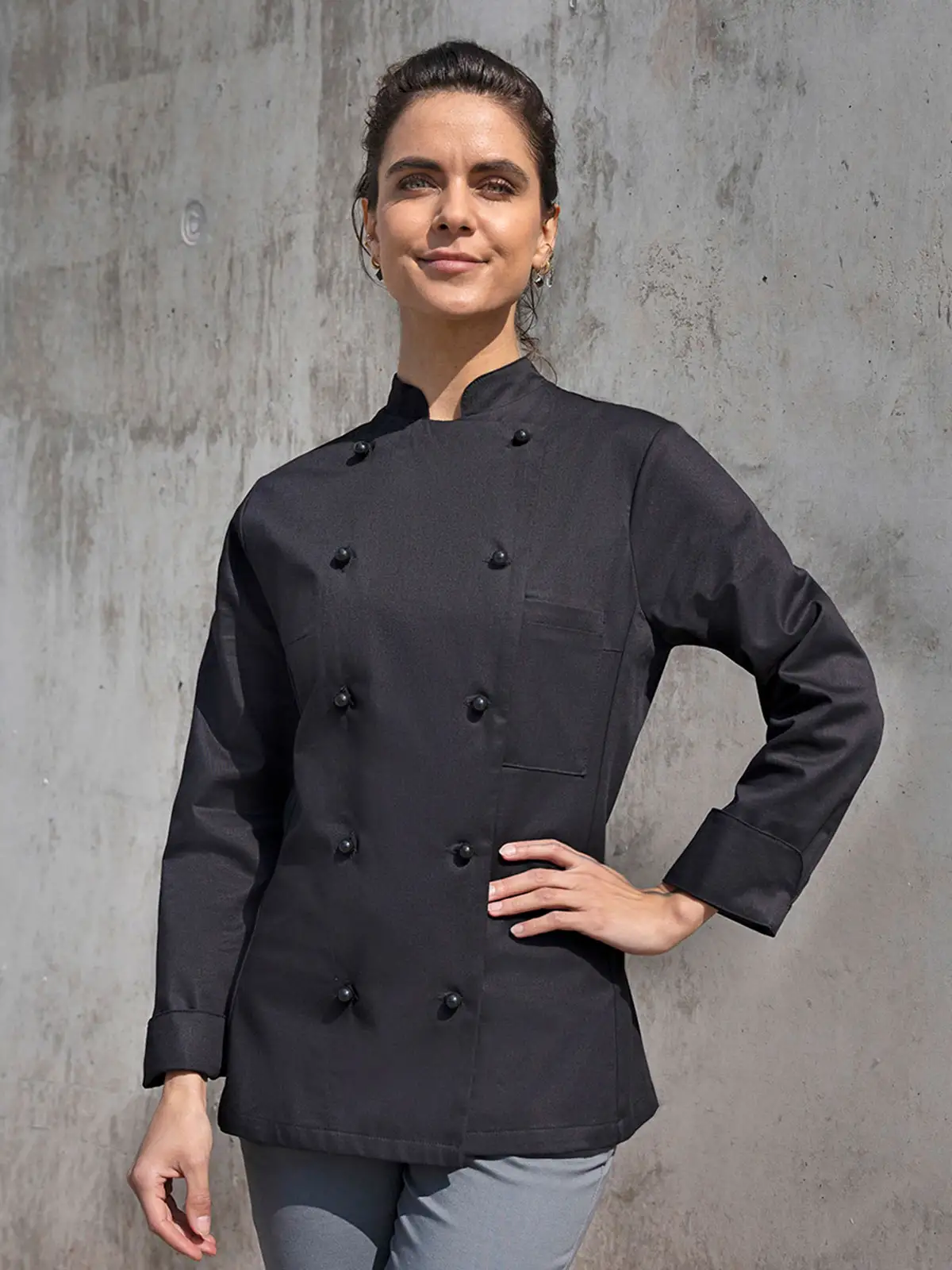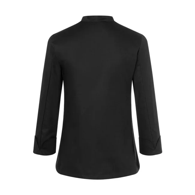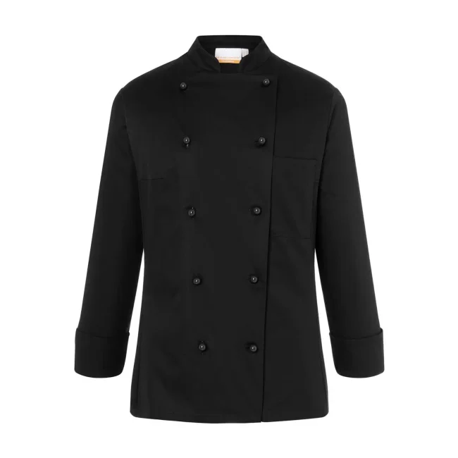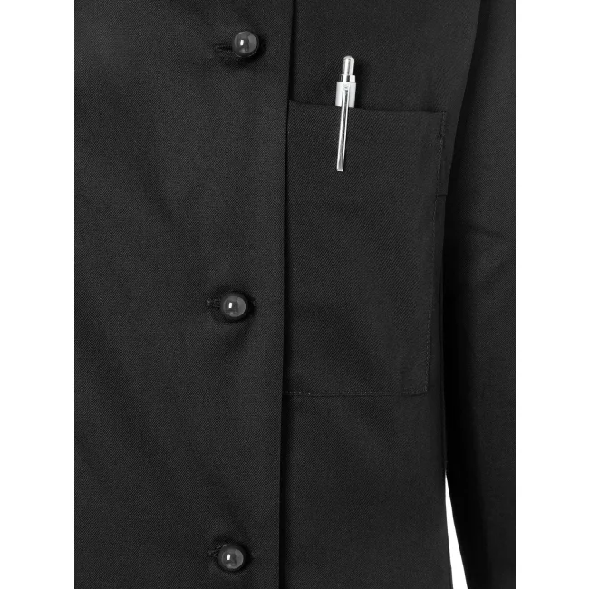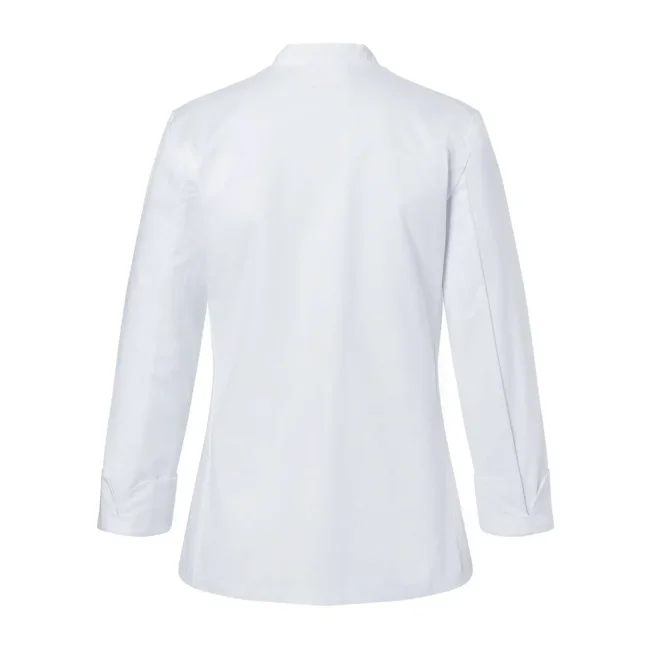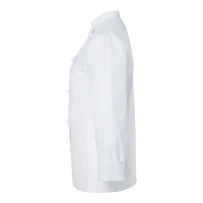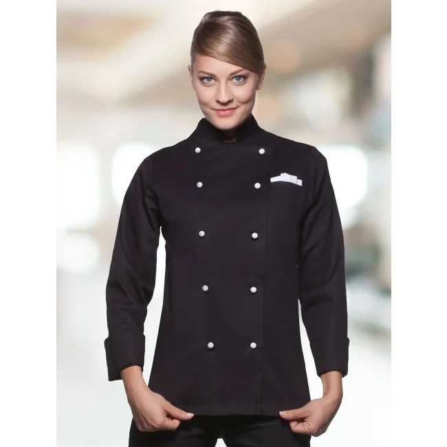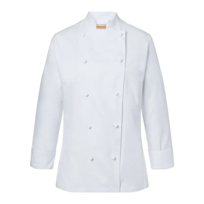100% cotone. Giacca da Cuoco Donna Agathe, 210 g/m² tessuto altamente rifinito, irrestringibile, non stinge. Giacca da chef aderente doppio petto a 10 bottoni, cuciture sul busto, tasca sul petto a sinistra, polsini con spacco. Da comprare separatamente striscia articolo KKL1 + bottoni disponibili in diversi colori (vedi articoli correlati). Adatta per lavaggi industriali a 95°C. Taglie: 34 - 54.