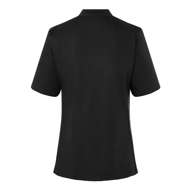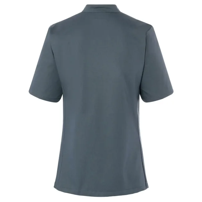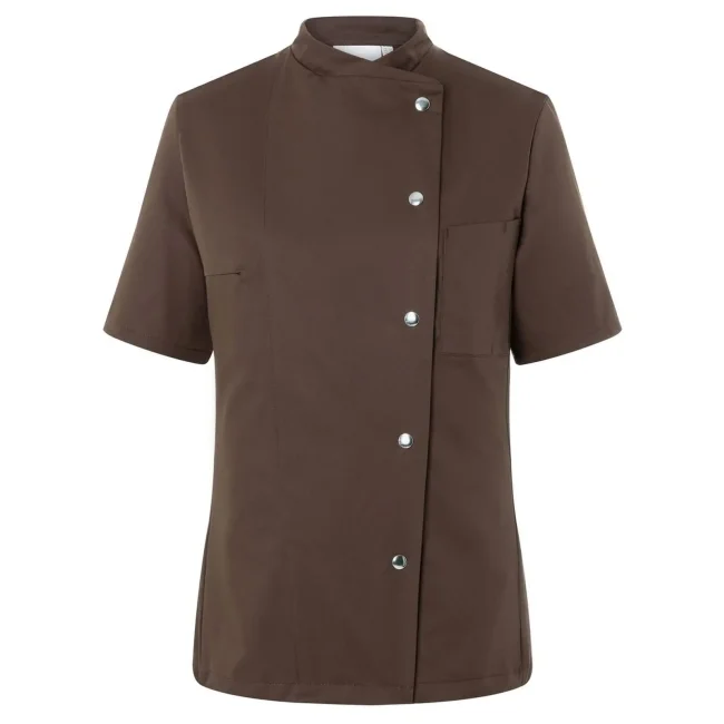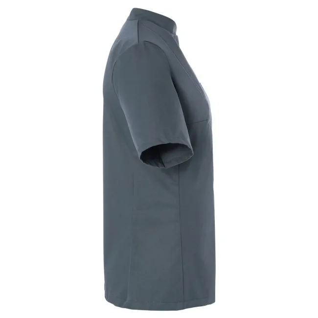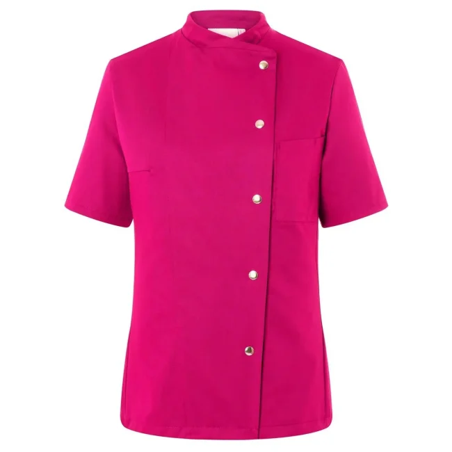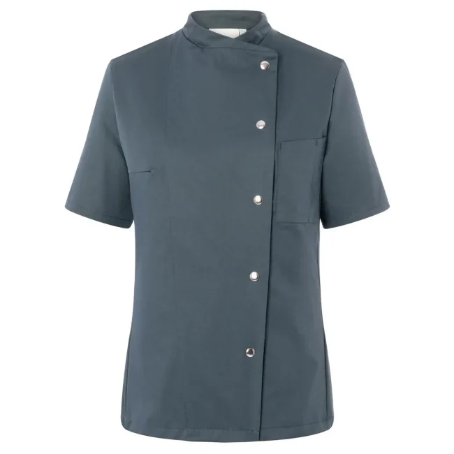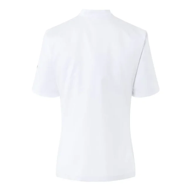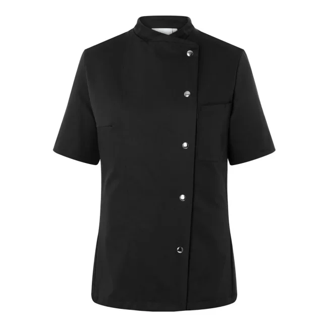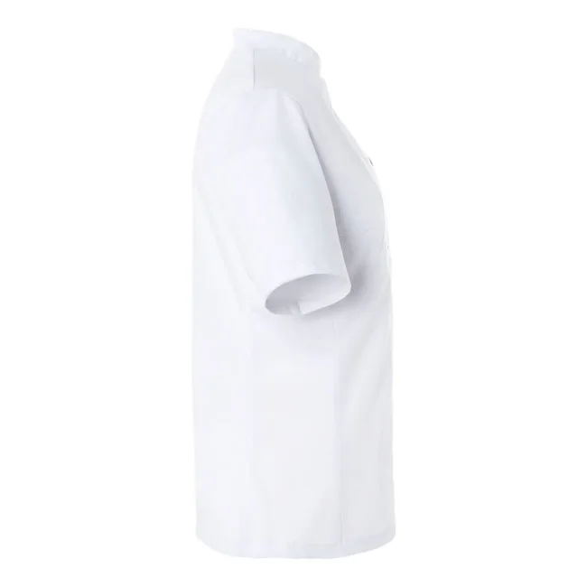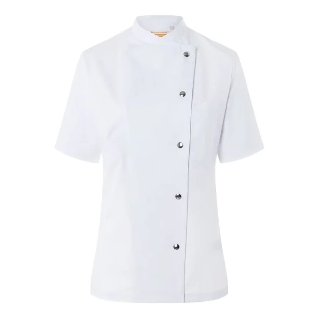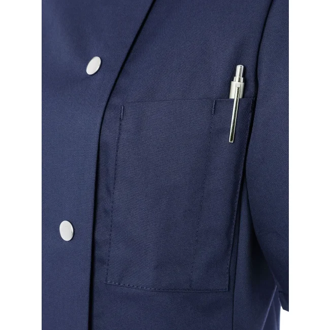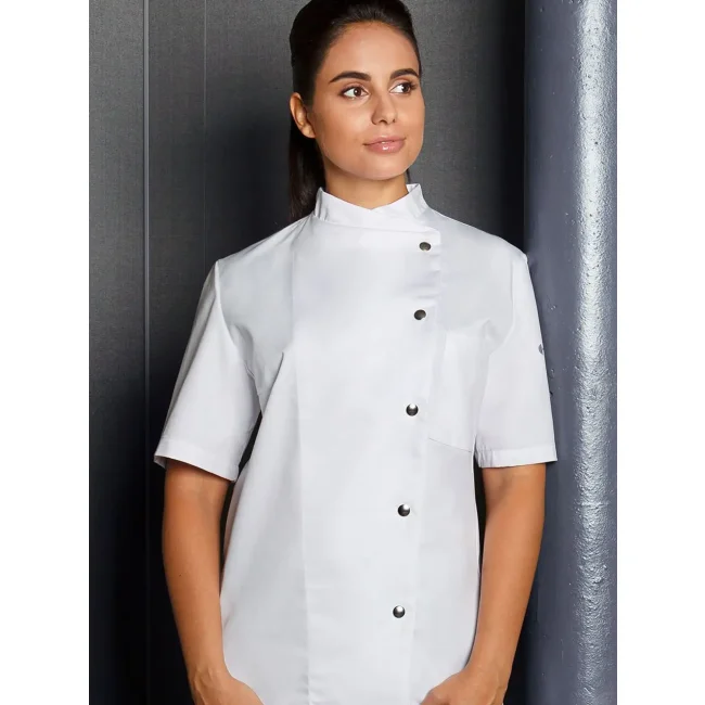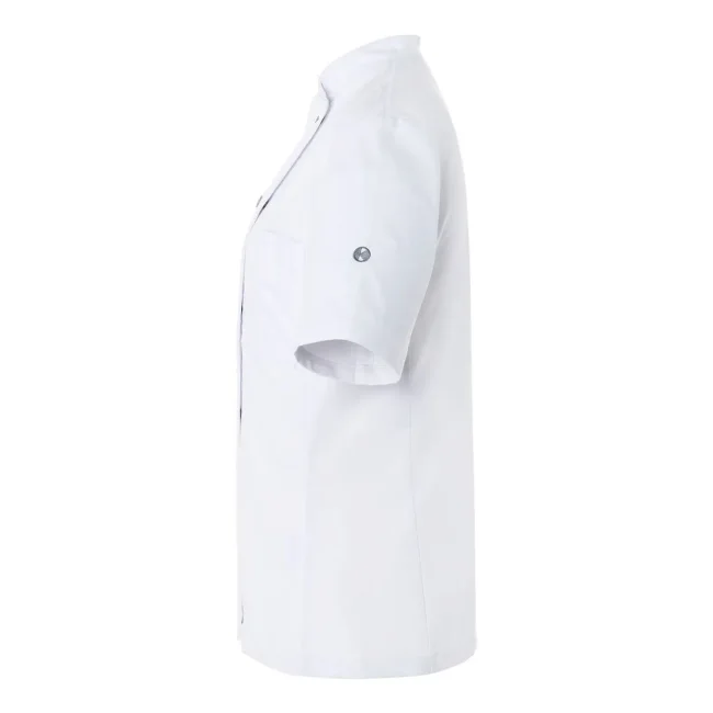 65% poliestere, 35% cotone. Giacca da Chef in tessuto rifinito, irrestringibile, vestibilità aderente, pence sul petto, laterali anteriori e posteriori, maniche corte, taschino porta penne asimmetrico al petto, 5 bottoni a pressione, adatto per lavaggi industriali. Lavabile fino a 95°.