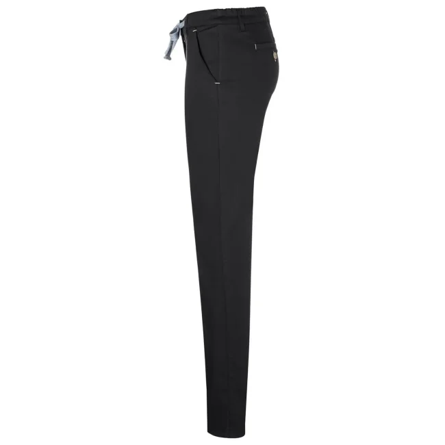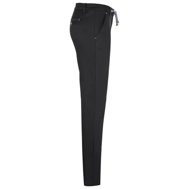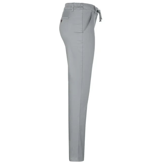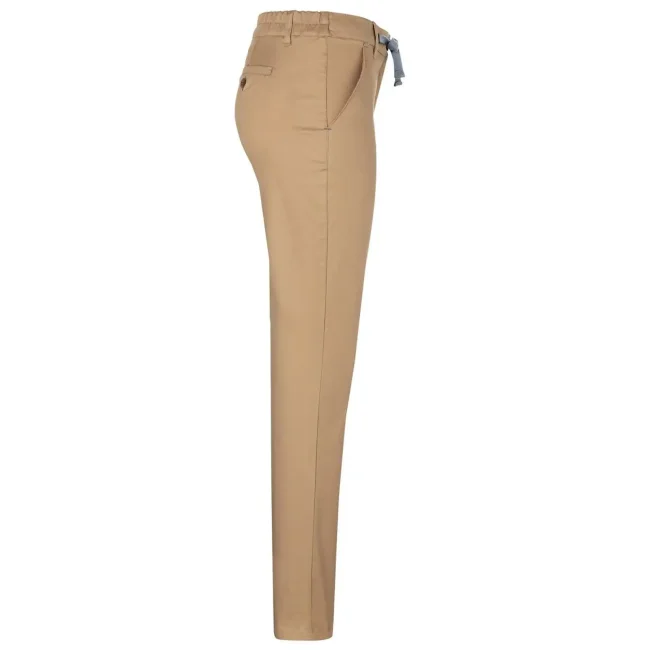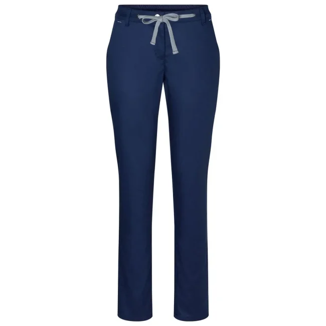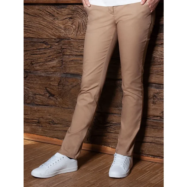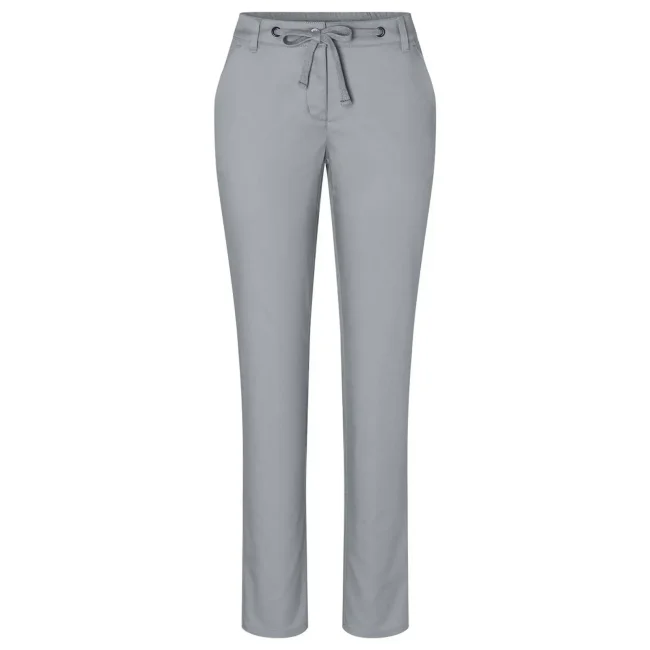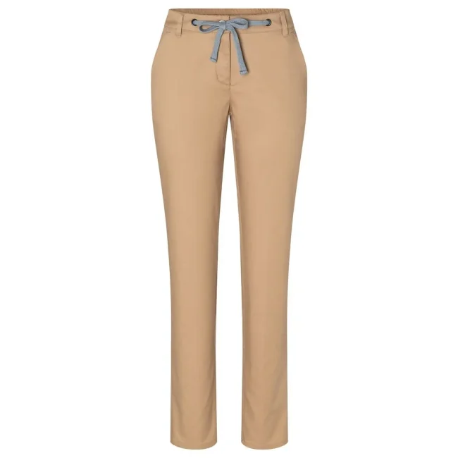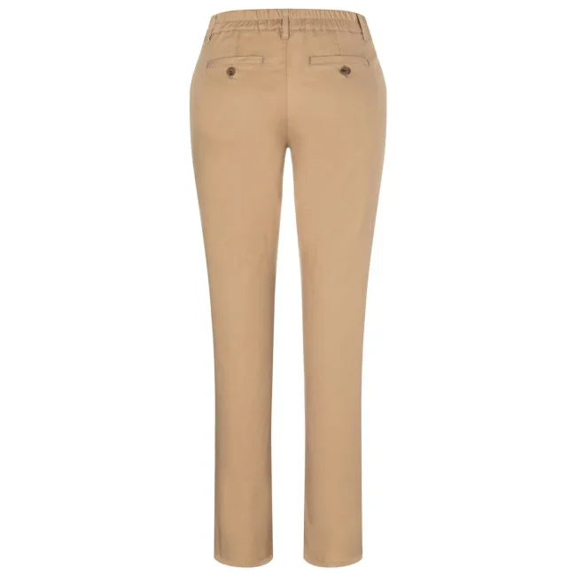 59% cotone, 39% poliestere, 2% elastan. Pantaloni informali da lavoro donna, leggeri, tessuto elasticizzato, taglio aderente, elastico flessibile e cordoncino in vita, orlo stretto, 2 tasche laterali e 2 tasche sul retro con bottoni, passanti della cintura.