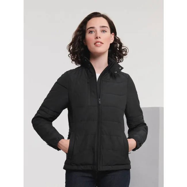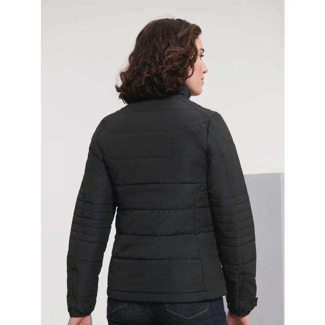 100% poliestere. Tessuto DWR ad alte prestazioni trattato con Aquapel di Nanotex,senza fluoro e PFC Giacca donna con imbottitura ecologica di Dupont Sorona. Taglio moderno. Collo montante con 2 bottoni a pressione e pattina frangivento interna per la protezione dal vento, tasca interna con zip, pattina decorativa per la manica con bottone a pressione. Accesso discreto per la decorazione sul lato sinistro interno del torace.