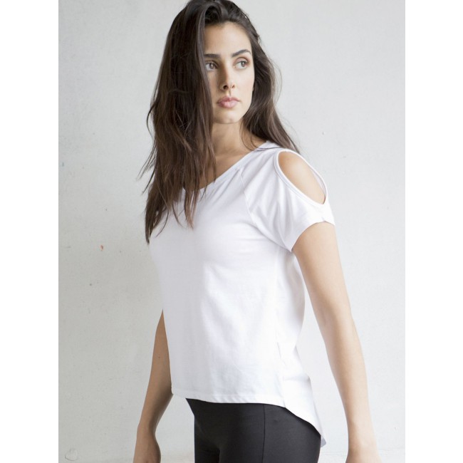 65% cotone, 35% poliestere. T-shirt manica corta con foro sulla spalla, girocollo, più lunga nella parte posteriore. Struttura con cuciture laterali. Col. HGR: 85% cot. 15% vis.
