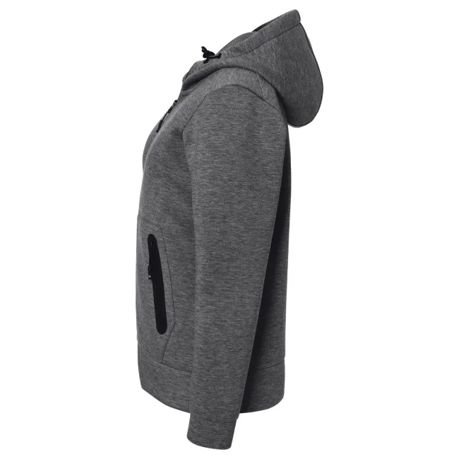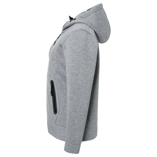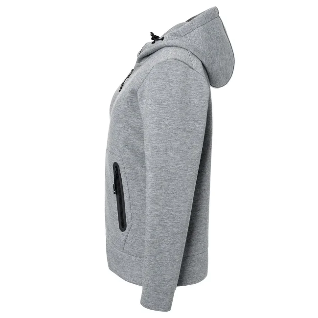 92% poliestere, 8% elastan. Giacca con cappuccio regolabile con cordoncino, tasca a marsupio con cerniera, leggermente sfiancata.