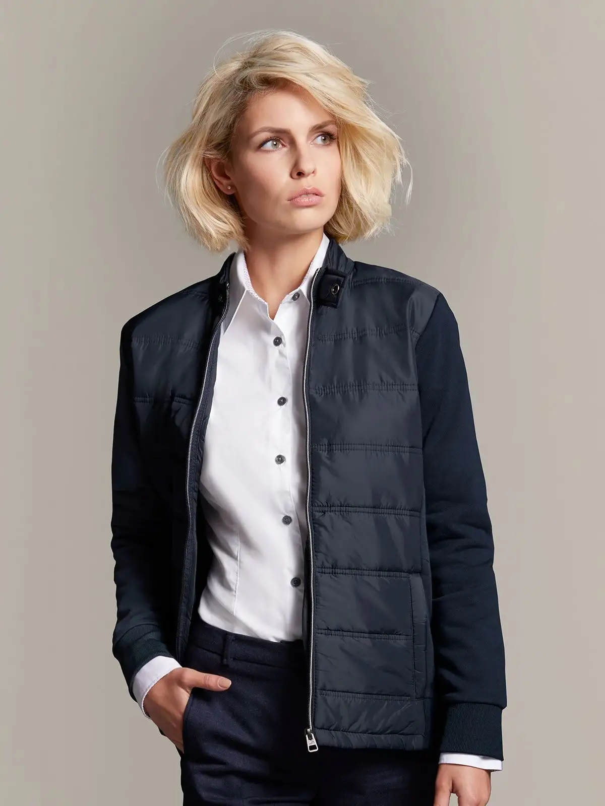 80% cotone, 20% poliestere. Giacca con imbottitura 100% poliestere. Retro e maniche di tessuto french terry, 2 tasche laterali con cerniera, 2 tasche interne. Leggermente sfiancata.