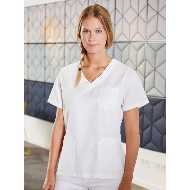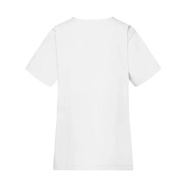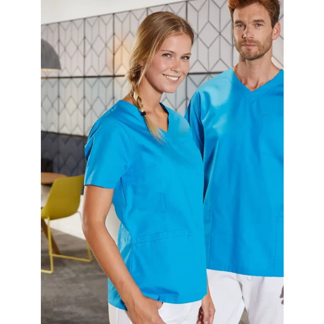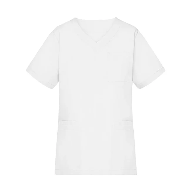 50% cotone 50% poliestere, 150 g/m2. Camice da lavoro con collo a V. Pince fronte e retro, spacchetti laterali, 2 ampie tasche laterali, 2 taschini sul fronte, un taschino sul petto. Lavabile a 95%C. Leggermente sfiancato.