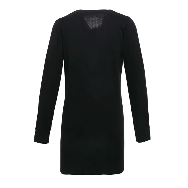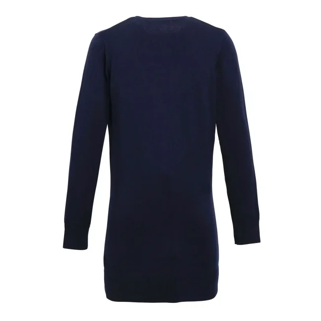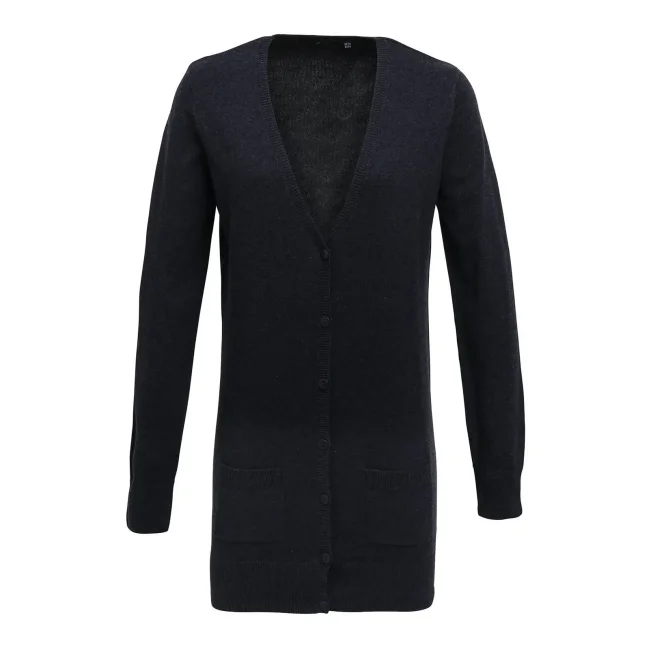 55% cotone, 45% acrilico. Cardigan da donna lungo, tessuto morbido, chiusura con cinque bottoni, due comode tasche, collo polsini e orlo in maglina. Cuciture laterali.