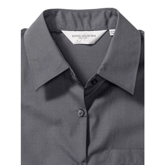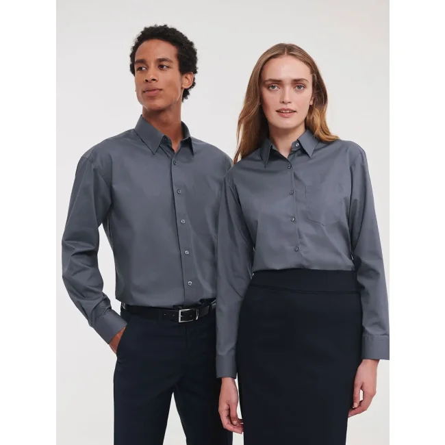 65% poliestere 35% cotone. Camicia in popeline con colletto classico con stecche, taschino a v, orlo stondato. Polsini stondati con due bottoni regolabili. (Col. 30: 110g/m²).