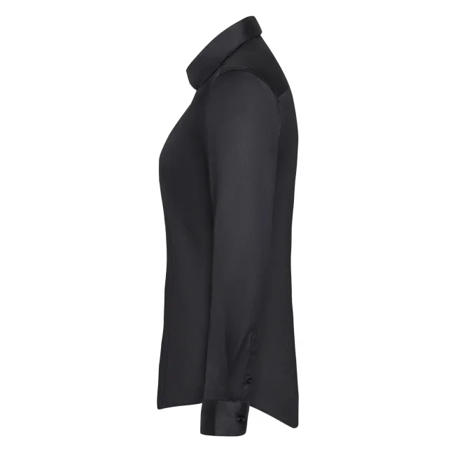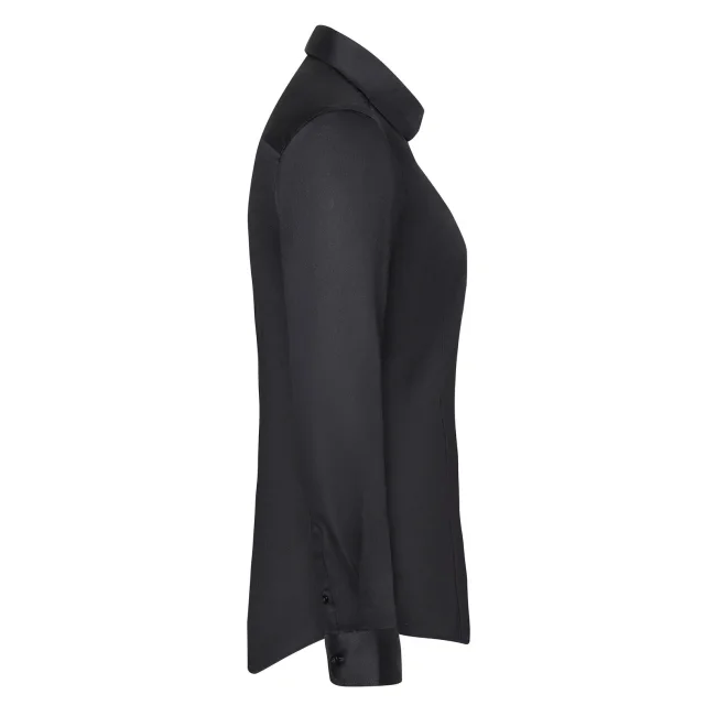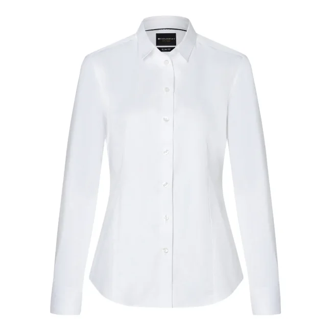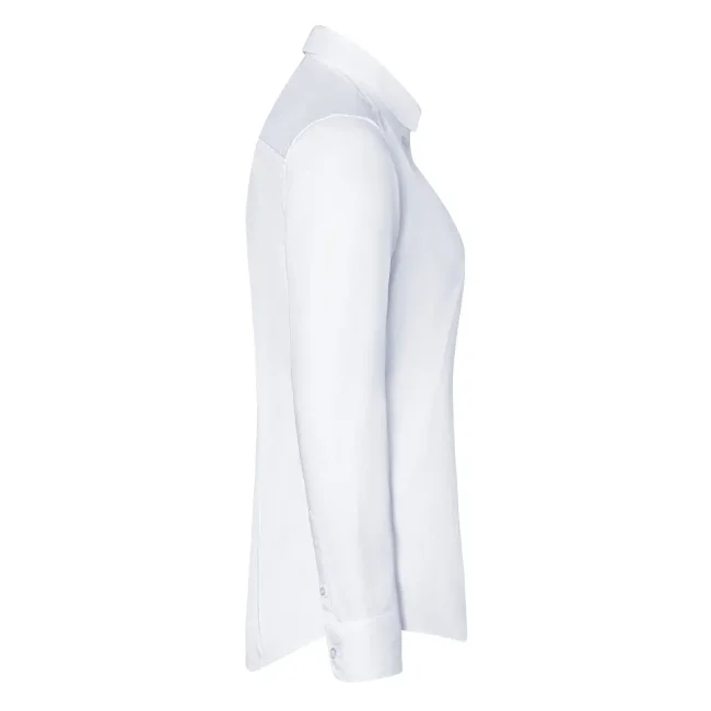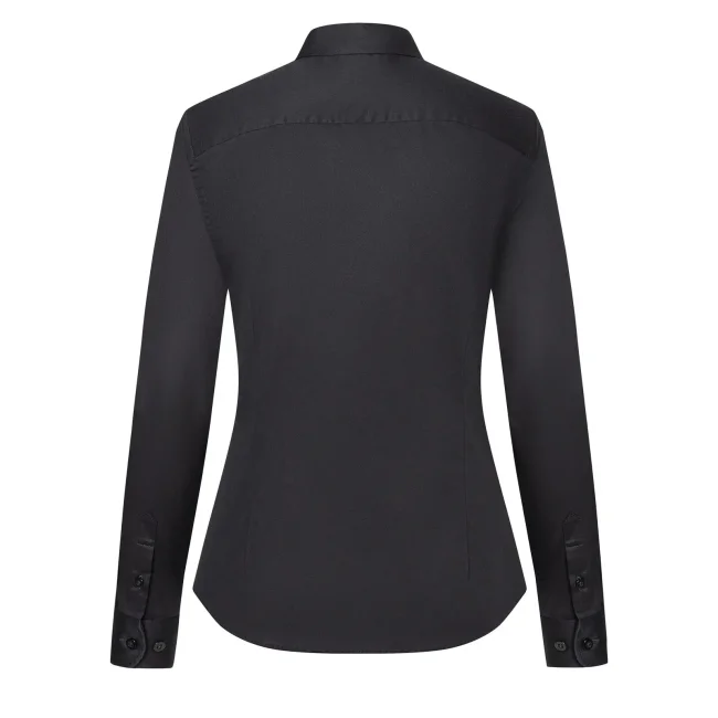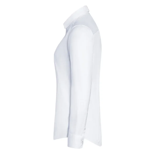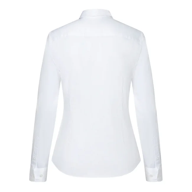 64% cotone, 32% poliestere, 4% elastan. Camicia a maniche lunghe da donna, vestibilità regolare, colletto classico, con polsino regolabile a doppio bottone, lavabile a 60°C