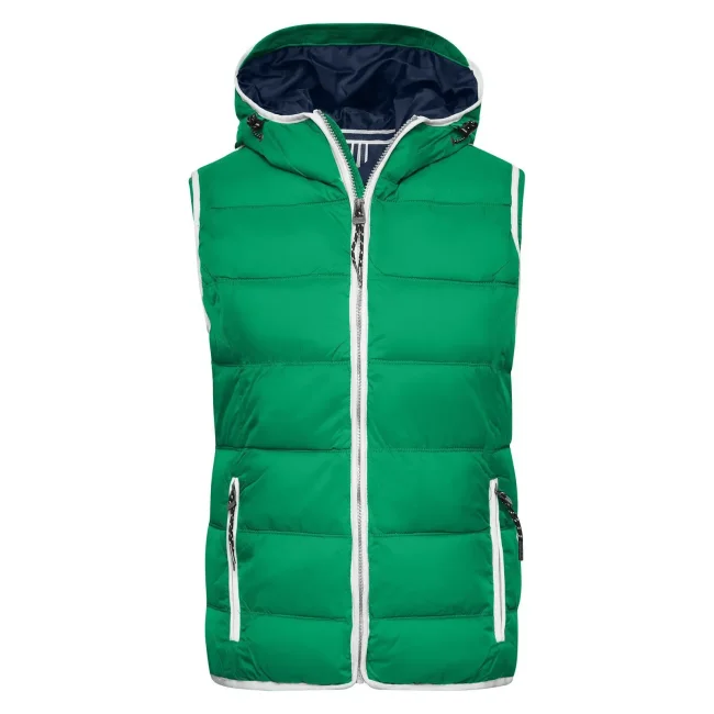 100% poliammide. Materiale esterno: 100% poliammide. Fodera e imbottitura: 100% poliestere. Gilet smanicato, imbottito e con cappuccio. Superificie opaca con leggero rivestimento in poliuretano, antivento e idrorepellente. Due tasche frontali e un taschino interno, giromanica elastico, cappuccio con cordino elastico e stopper. Leggermente sfiancato.