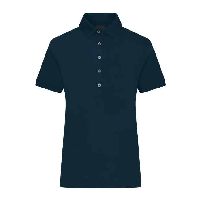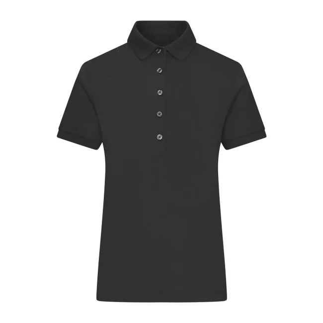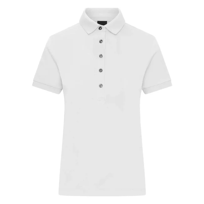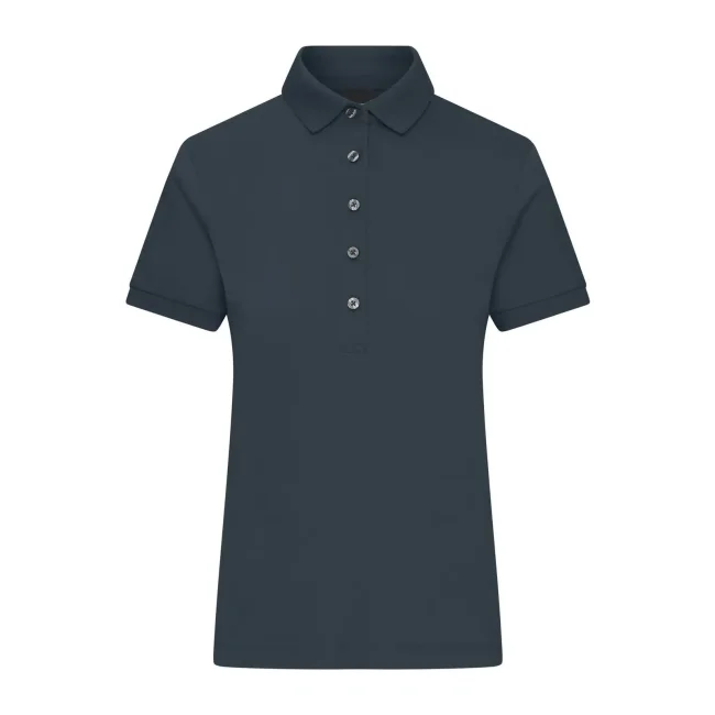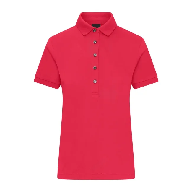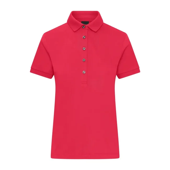 100% cotone. Polo in pregiato jersey singolo di alta qualità in cotone mercerizzato, pettinato ring-spun, colletto e giromanica in maglia, spacchetti laterali, 5 bottoni color titanio per tutti i colori, sciancrata.