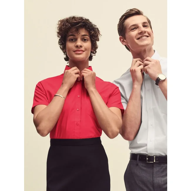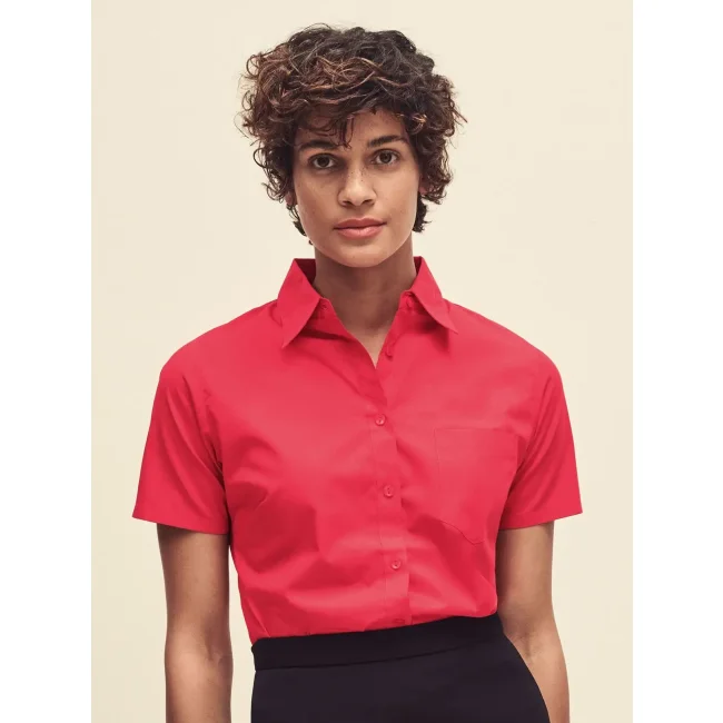 55% cotone, 45% poliestere. Camicia da donna con taglio leggermente sfiancato, pinces sul petto e nella schiena. Bottoni in tinta, taschino lato cuore. (Col. 30: 115 g/m²).