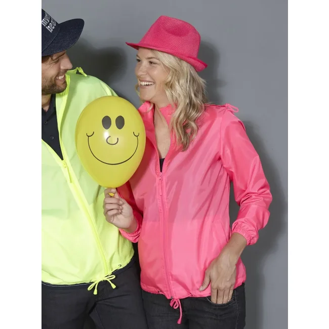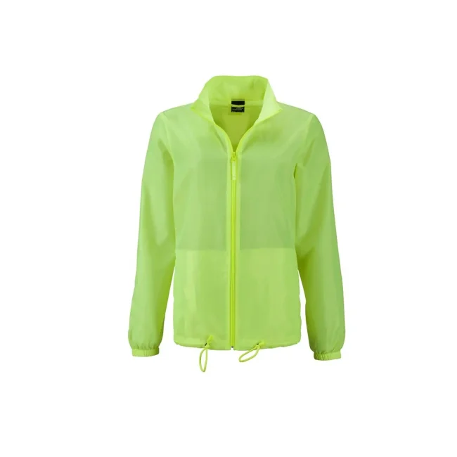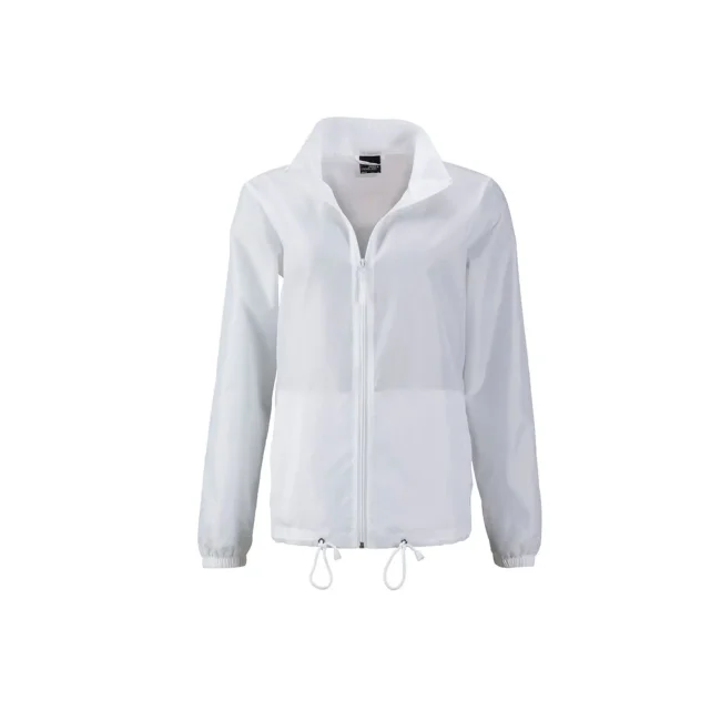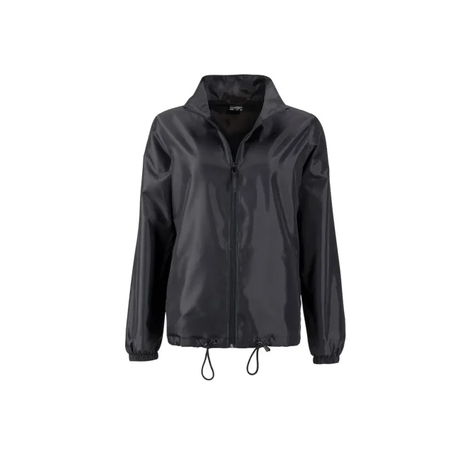 100% poliestere. Giacca dal tessuto leggero, antivento, idrorepellente (colonna d'acqua 600 mm) 2 tasche laterali, cappuccio con cordoncino integrato nel collo, bande elastiche sulle maniche, leggermente sfiancata.