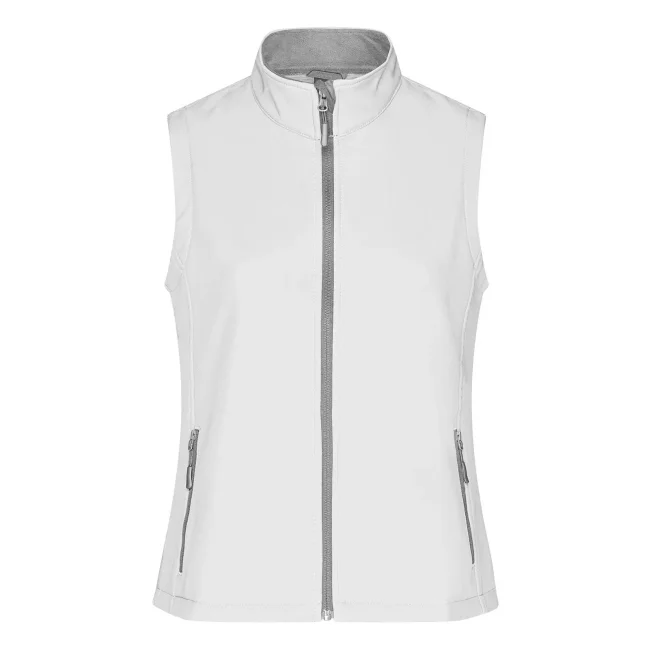 100% poliestere. Gilet softshell a due strati, stampabile, idrorepellente, antivento, traspirante, lato interno in morbido micropile, Zip anteriore a tutta lunghezza, nascosta e riflettente con protezione per il mento, 2 tasche laterali con cerniera, 2 tasche interne, sciancrata, 100% poliestere, antivento e idrorepellente, sfiancato.