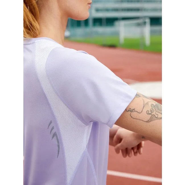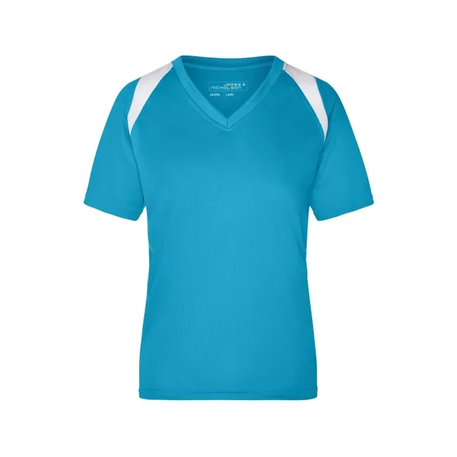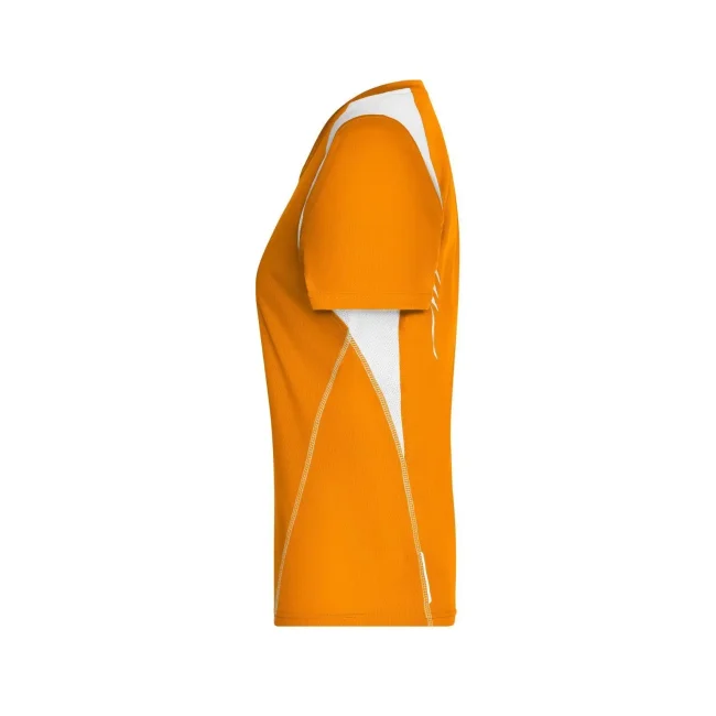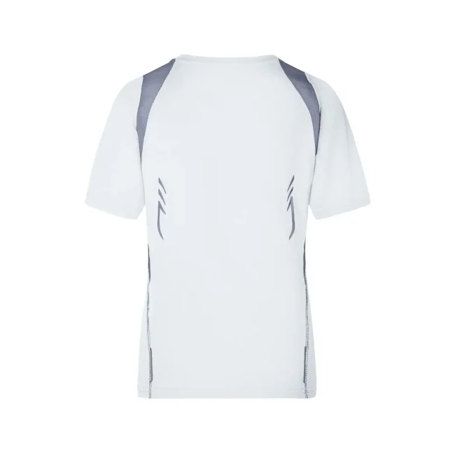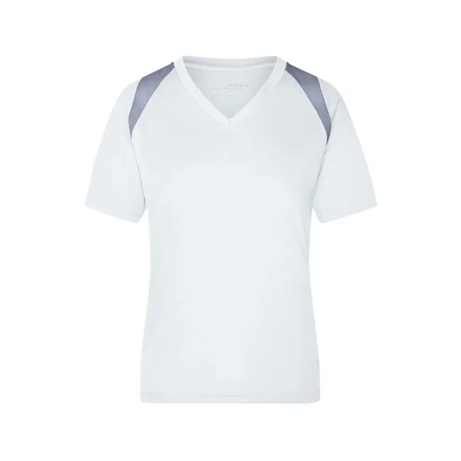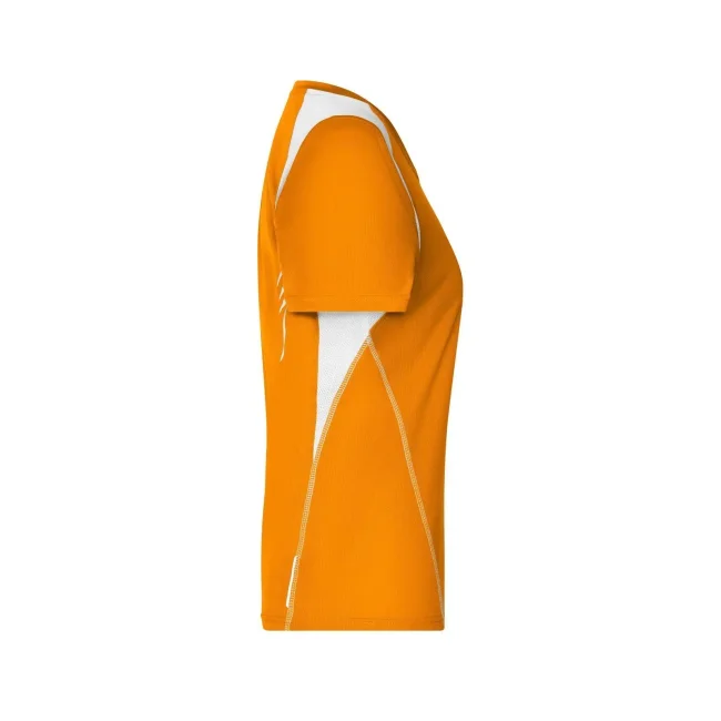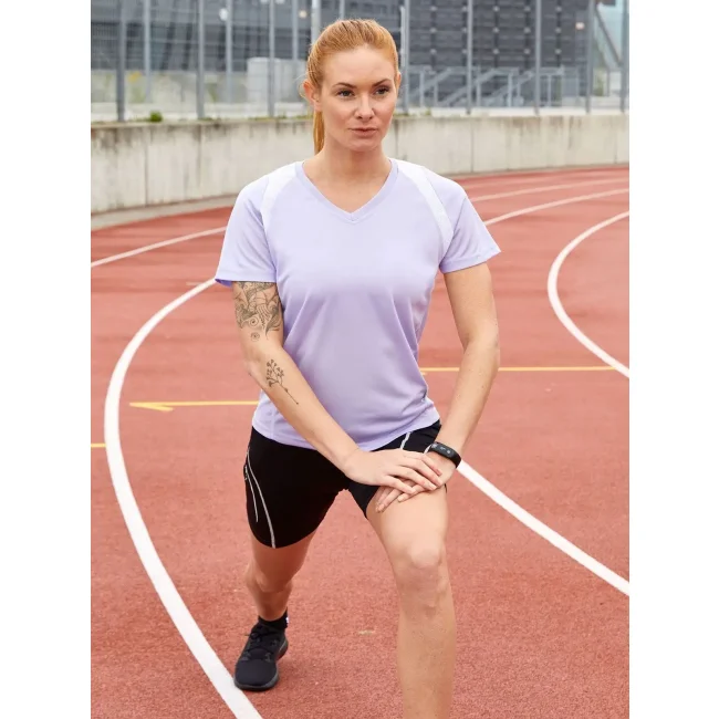 100% poliestere. T-shirt maniche corte, collo a V, tessuto leggero e comodo, traspirante, regola l'umidità, ad asciugatura rapida. Cuciture piatte, bordini e transfer riflettenti. Leggermente sfiancata, struttura con cuciture laterali.